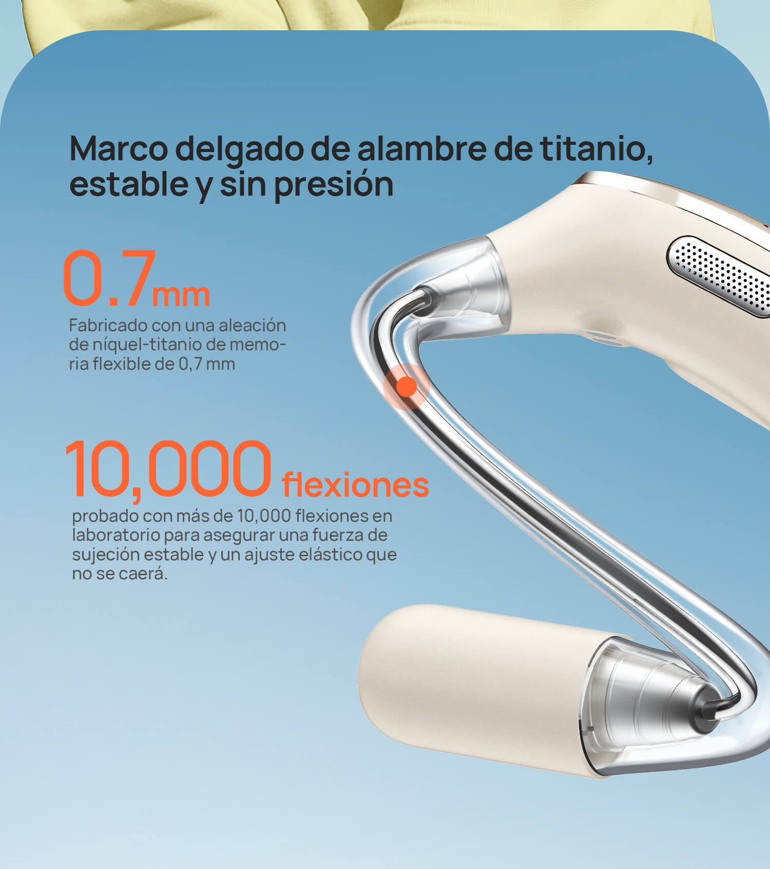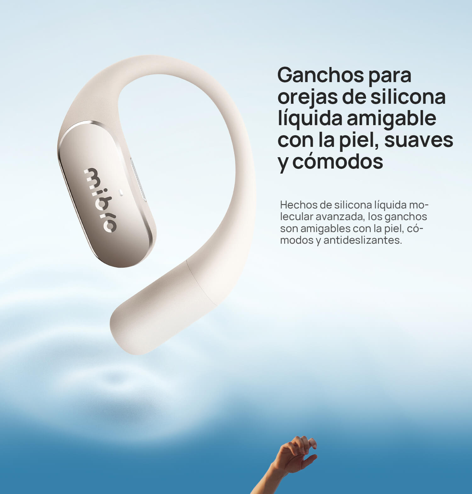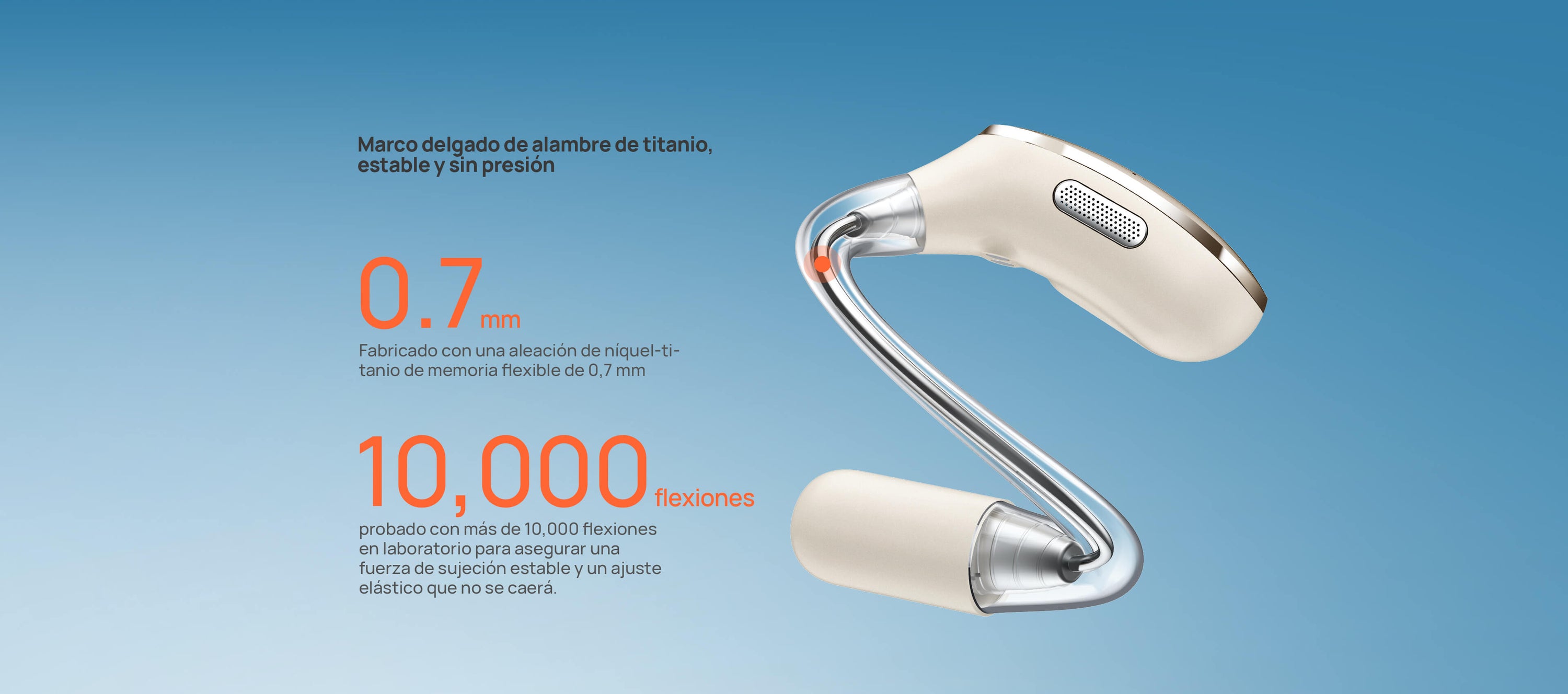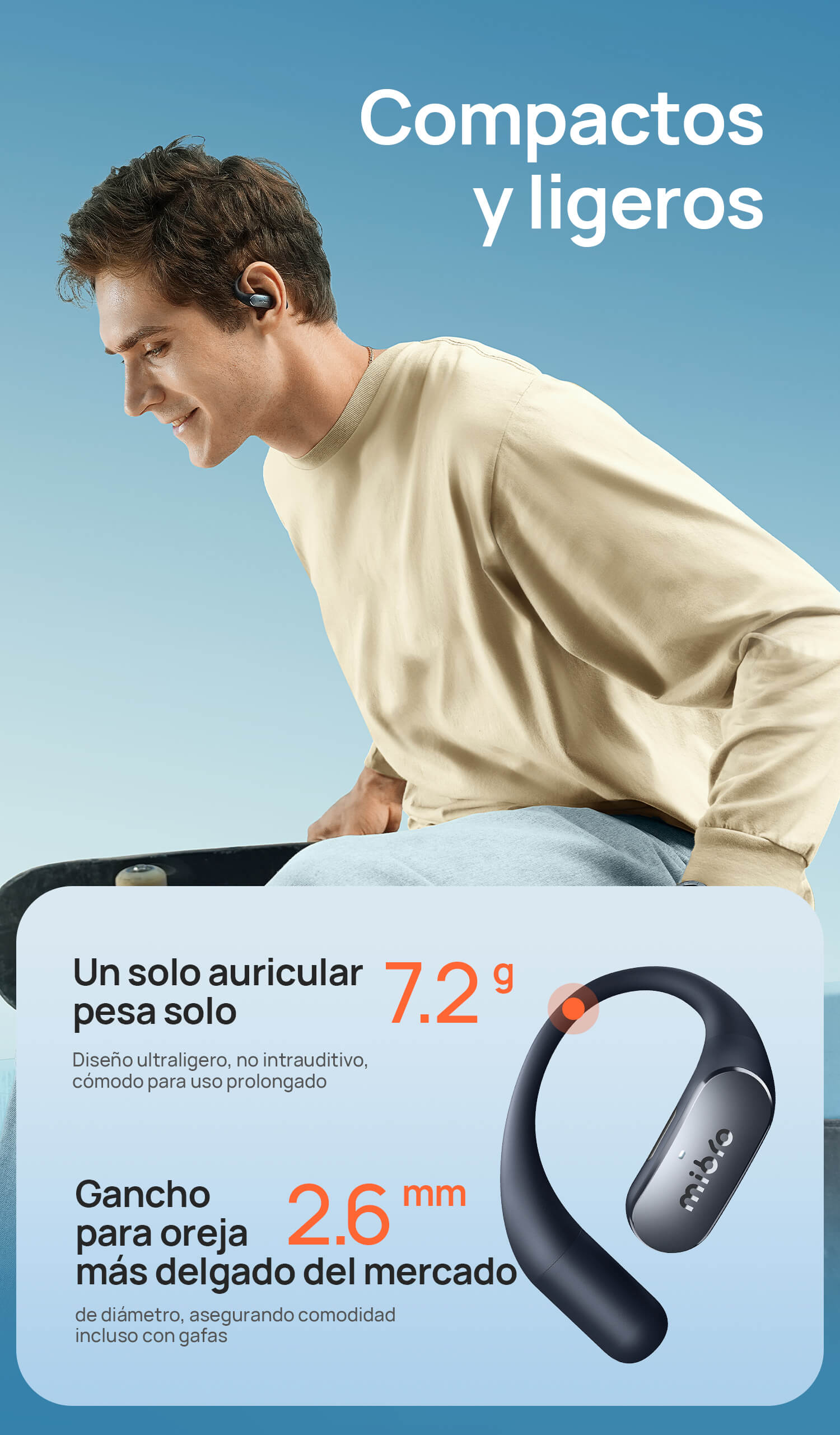 Solo 7,2g con estructura open-ear sin presión. Ganchos de titanio delgado y silicona molecular, antideslizantes e hipoalergénicos.