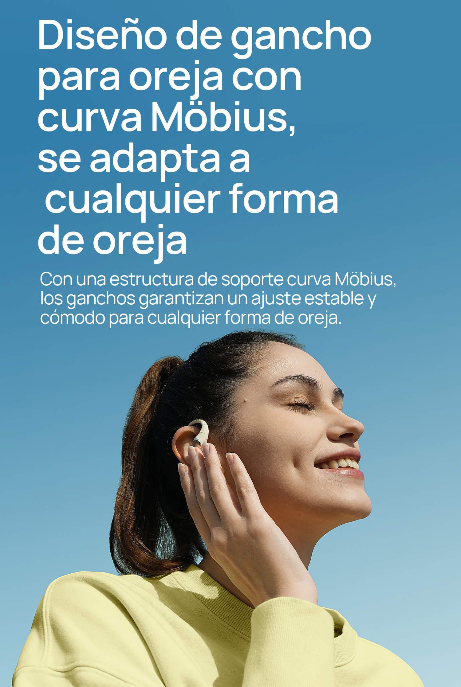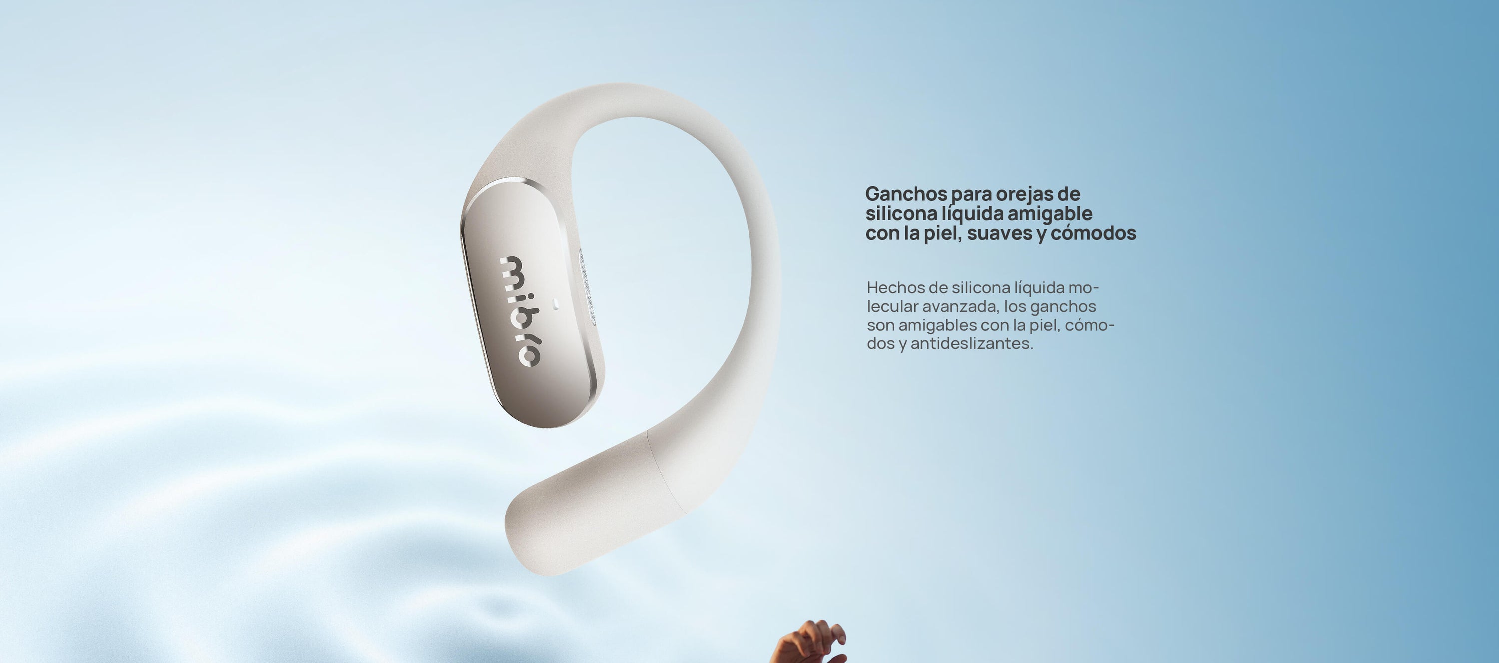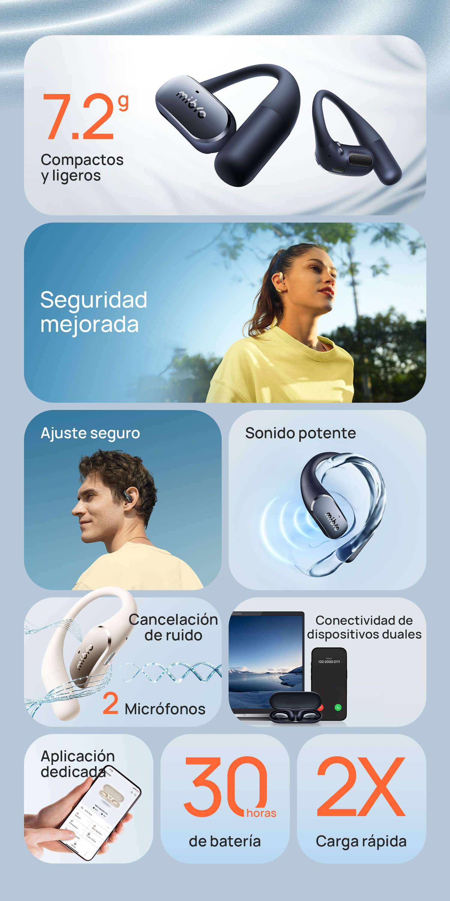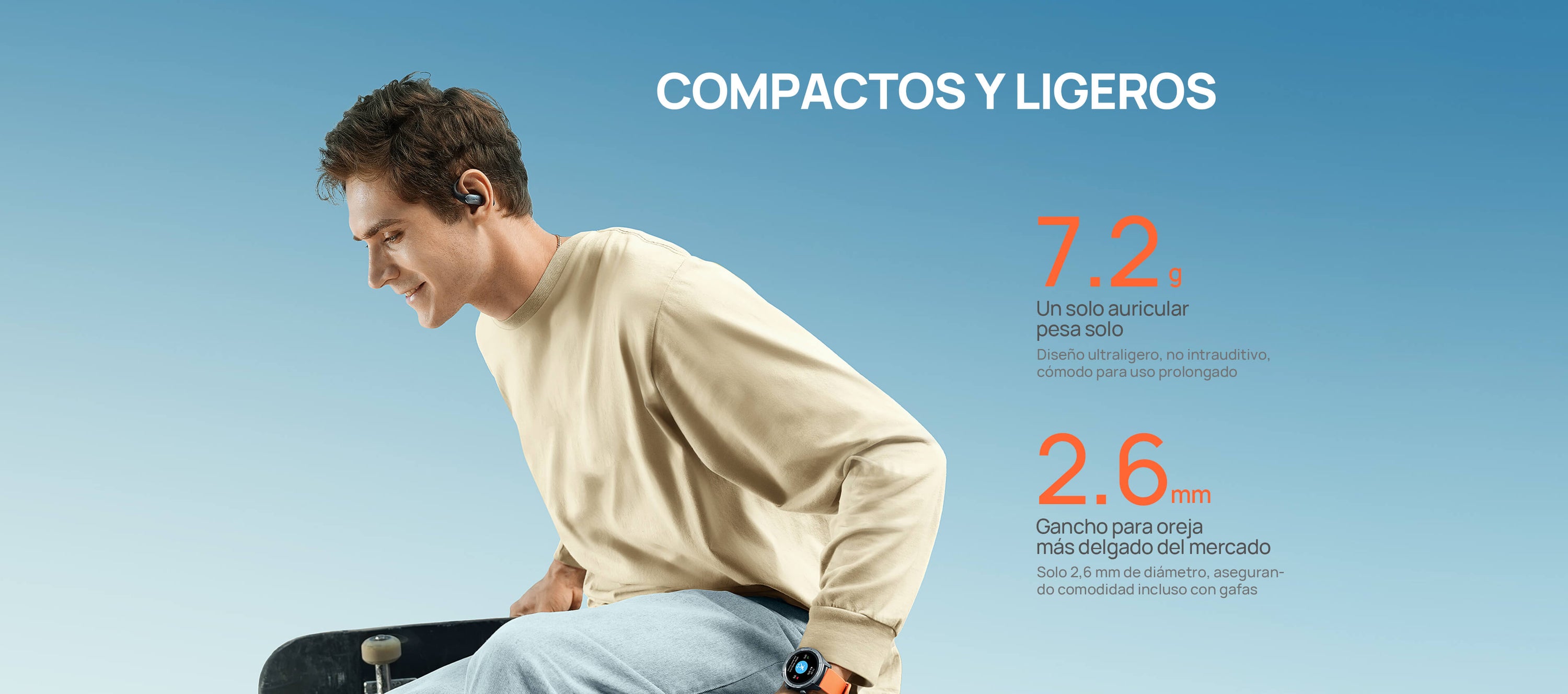 Solo 7,2g con estructura open-ear sin presión. Ganchos de titanio delgado y silicona molecular, antideslizantes e hipoalergénicos.