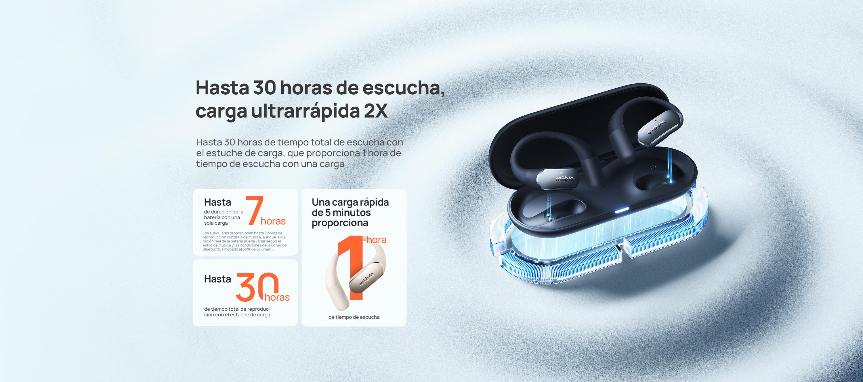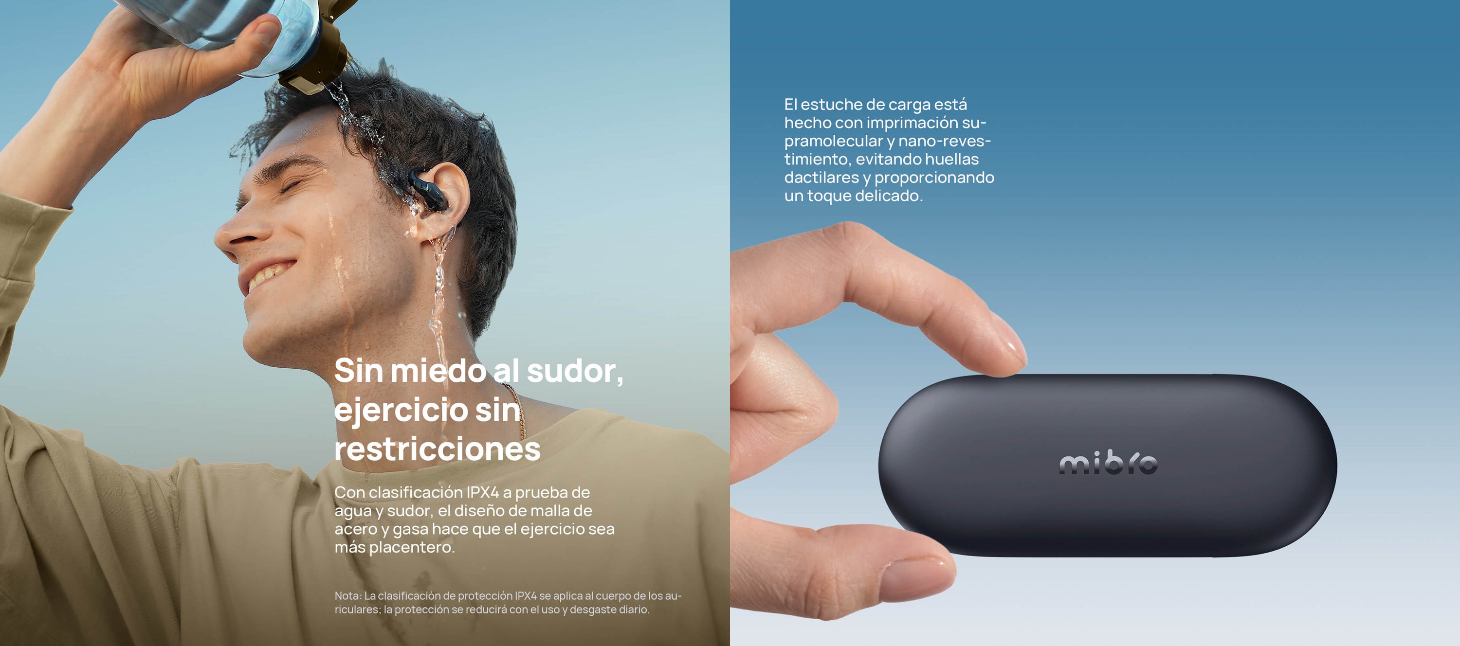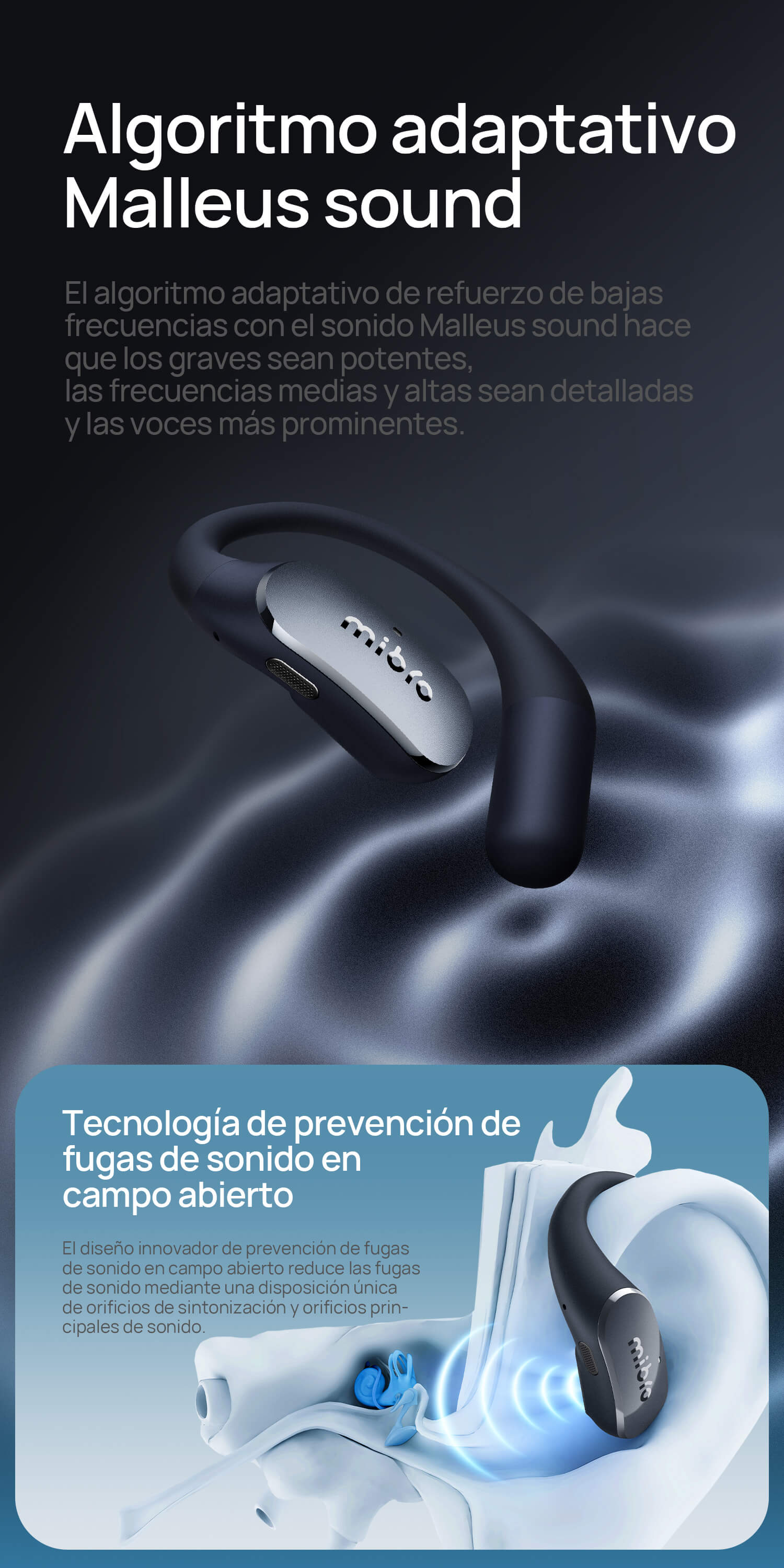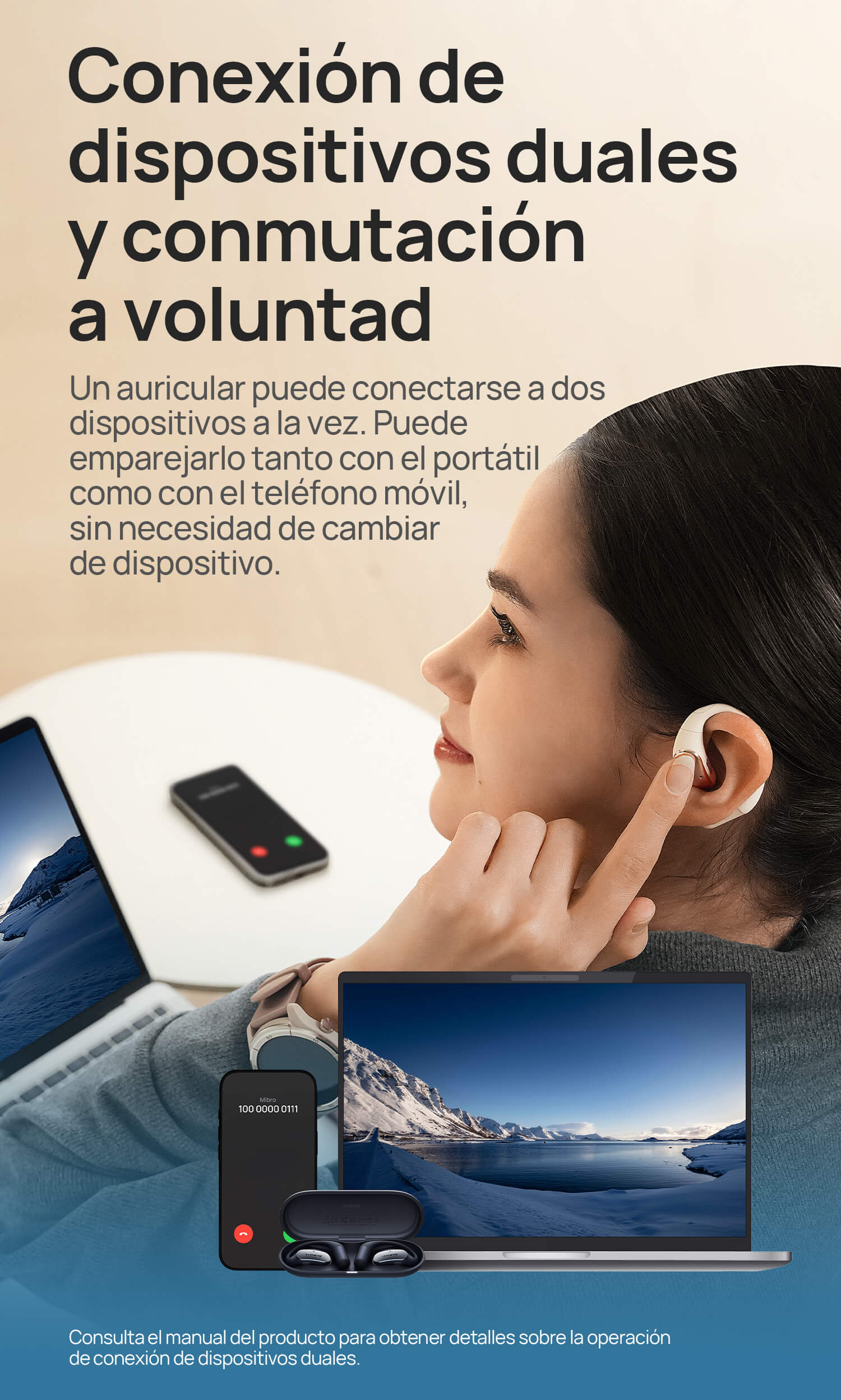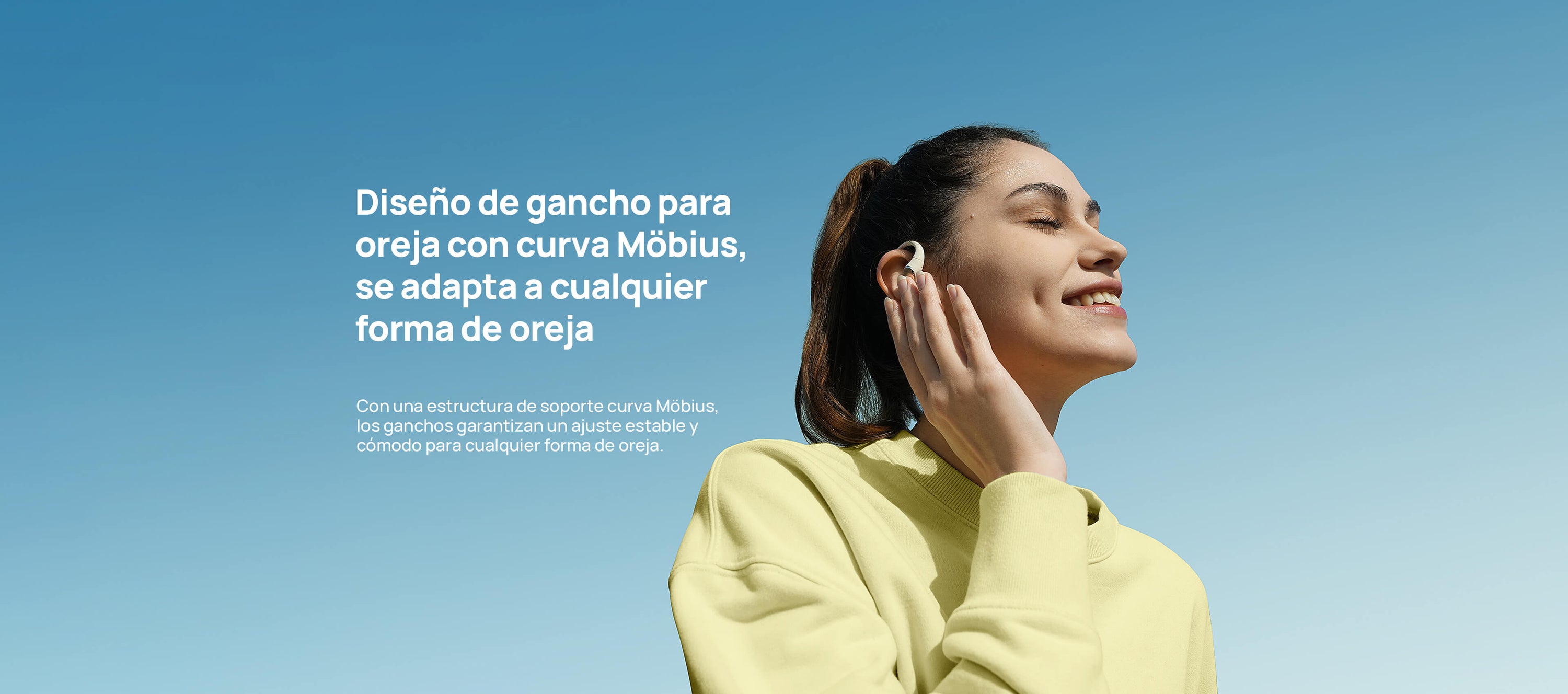 Solo 7,2g con estructura open-ear sin presión. Ganchos de titanio delgado y silicona molecular, antideslizantes e hipoalergénicos.