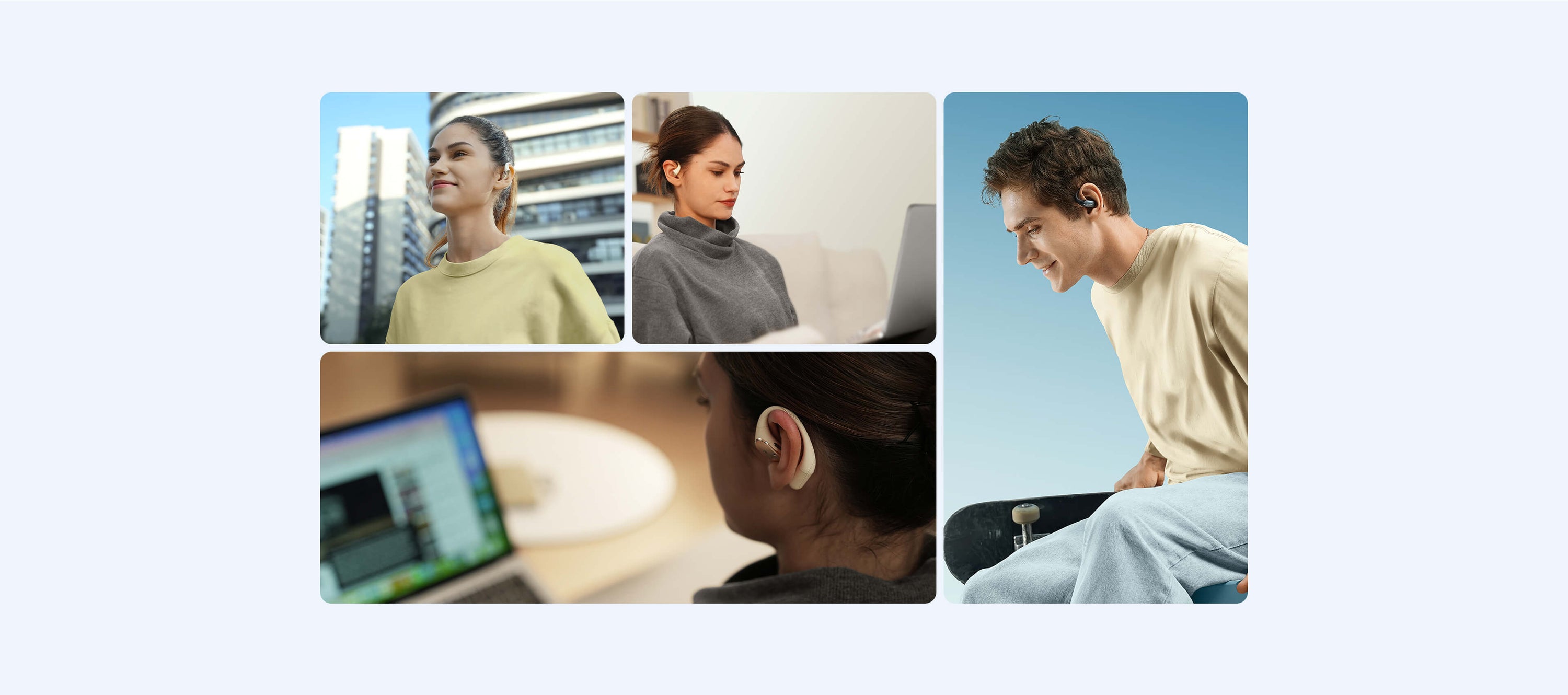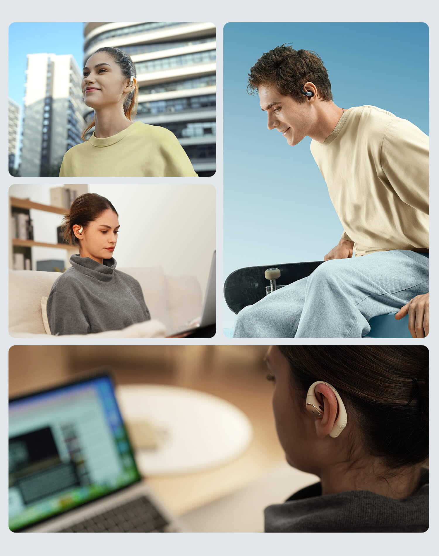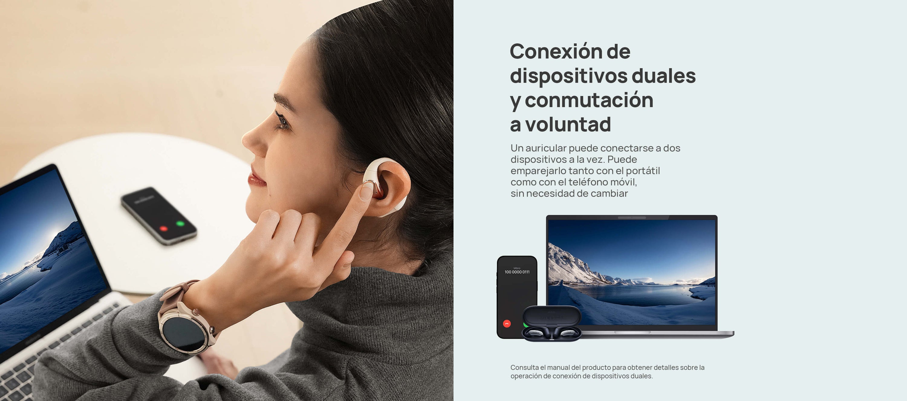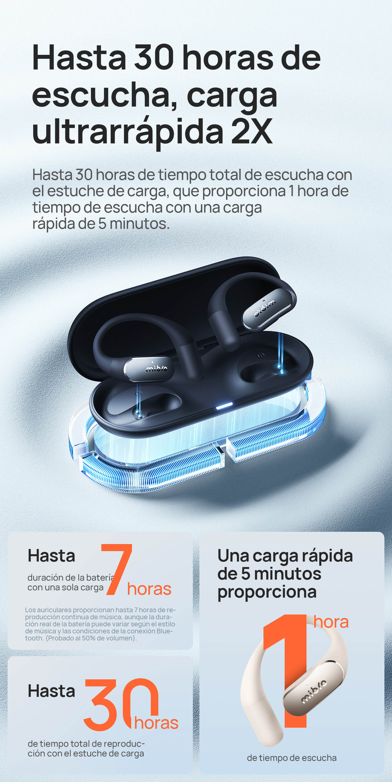 Solo 7,2g con estructura open-ear sin presión. Ganchos de titanio delgado y silicona molecular, antideslizantes e hipoalergénicos.