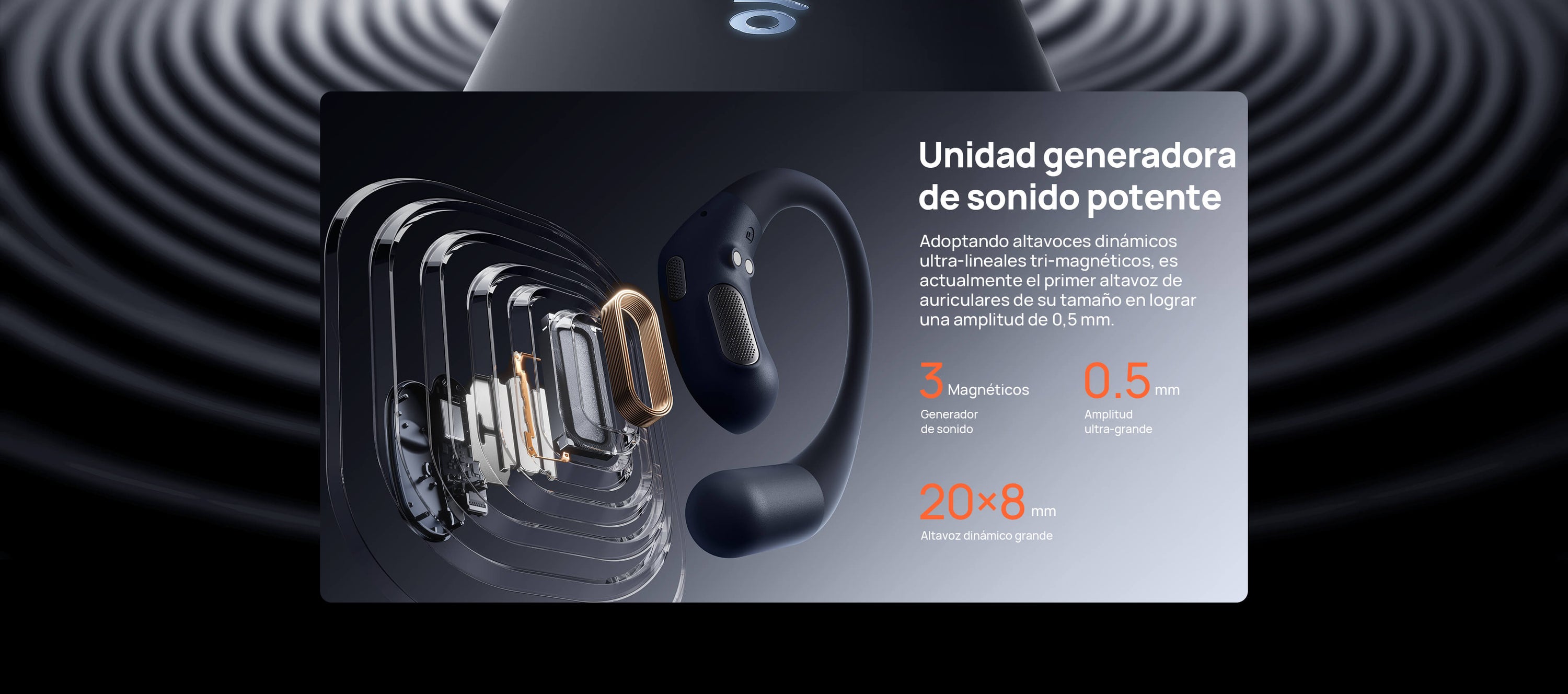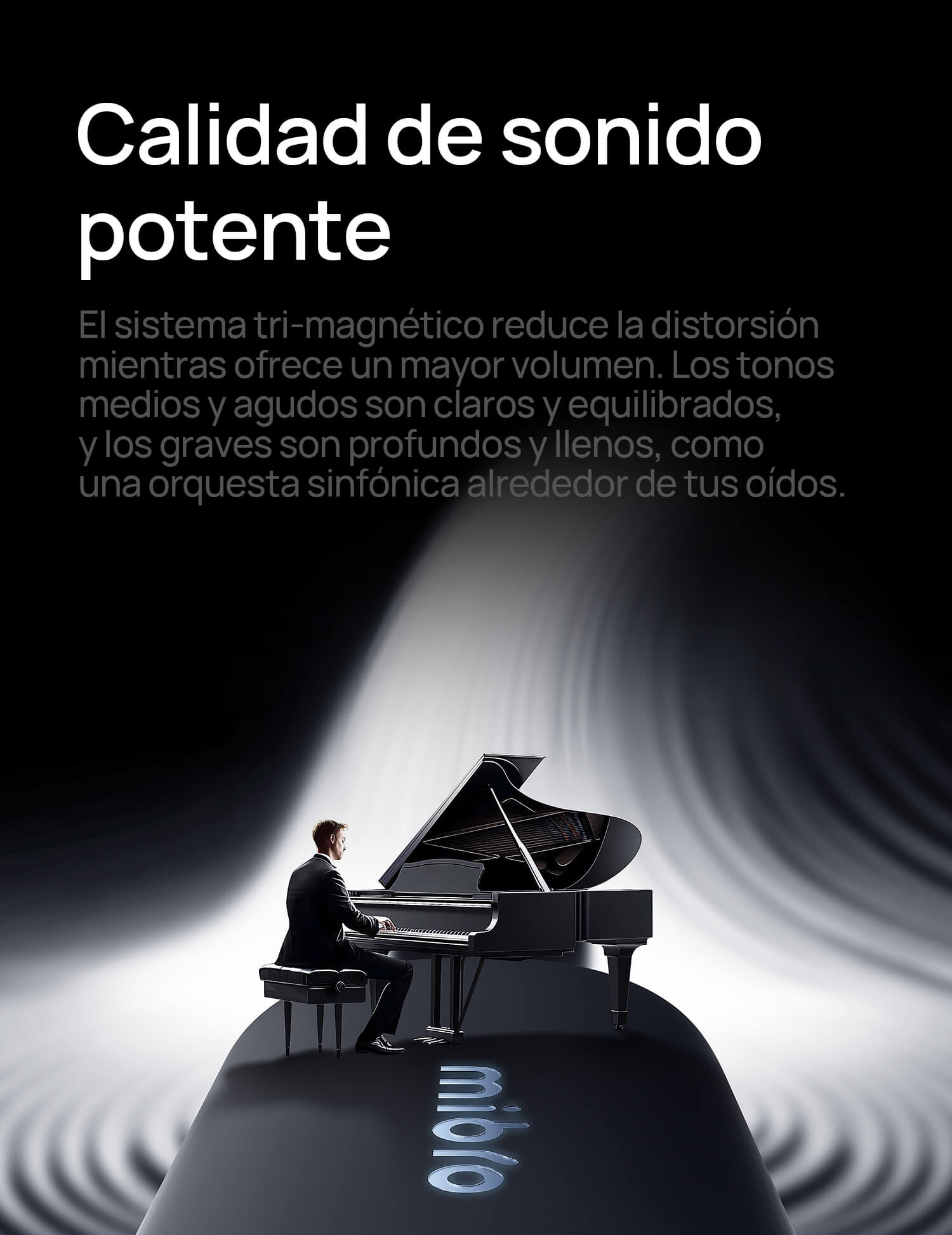 Tecnología acústica abierta mantiene sonidos ambientales. Agujeros únicos minimizan fugas. Medios y agudos claros, graves potentes.