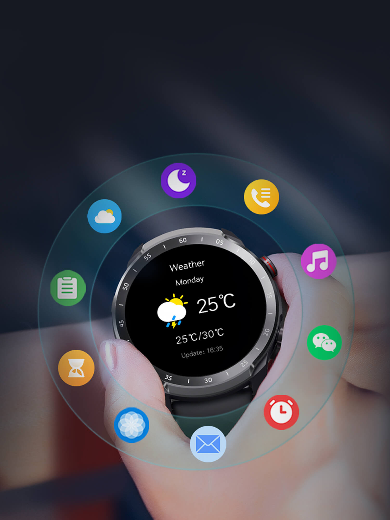 Empuje de mensajes de aplicaciones, empuje del tiempo, empuje de llamadas entrantes, recordatorio de salud, gestión de contactos, encontrar reloj, fotografías remotas, ajuste de Waterface, registro de movimientos, registro de sueño,...