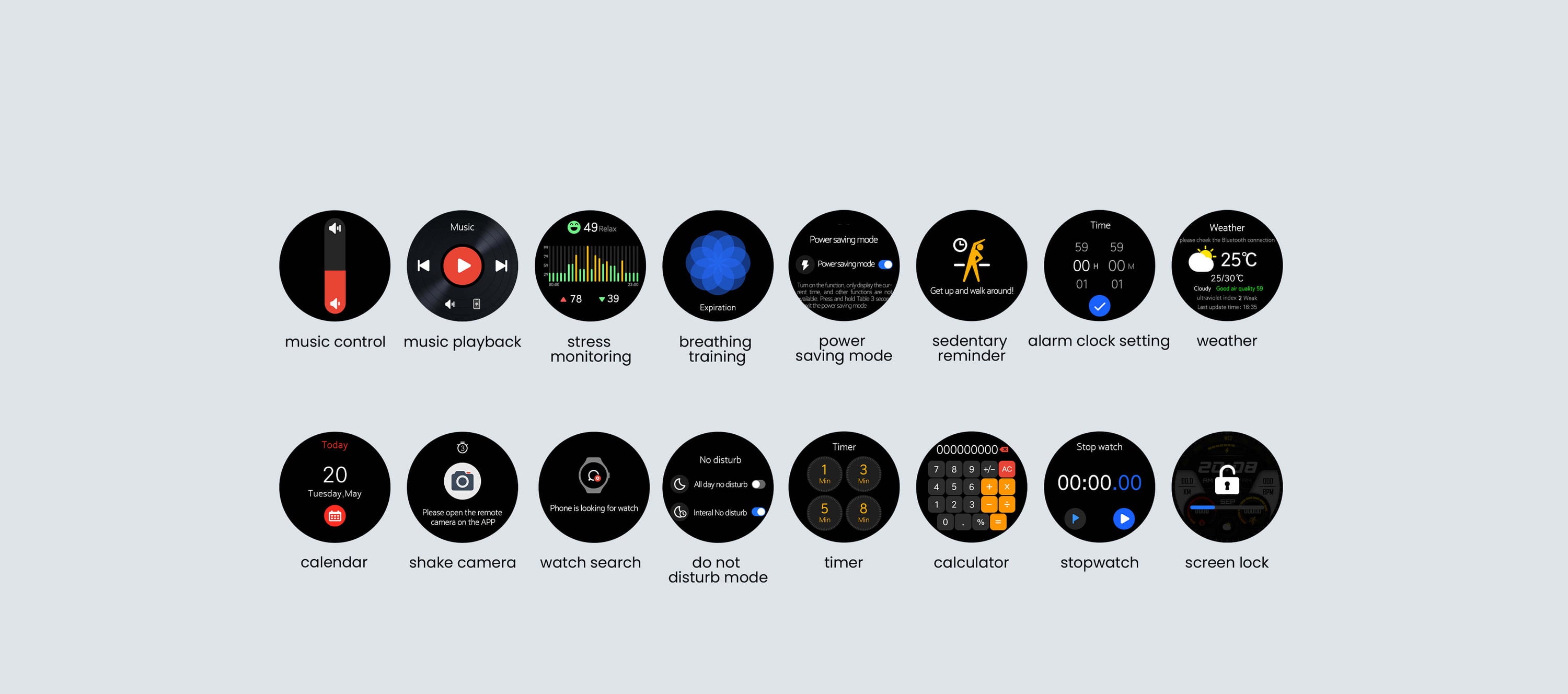 Ritmo cardiaco,SpO2,Registro de movimientos,Respiración,Preesura,Registro de sueño,Temporizador,Alarma,Cronómetro,Calculadora,Calendario,Tiempo,Salud femenina,Encuentra tu teléfono,Llamada Bluetooth,Control de música,Reproducción de música,Recordatorio de mensaje de aplicación,Recordatorio de llamada entrante,Recordatorio de salud...