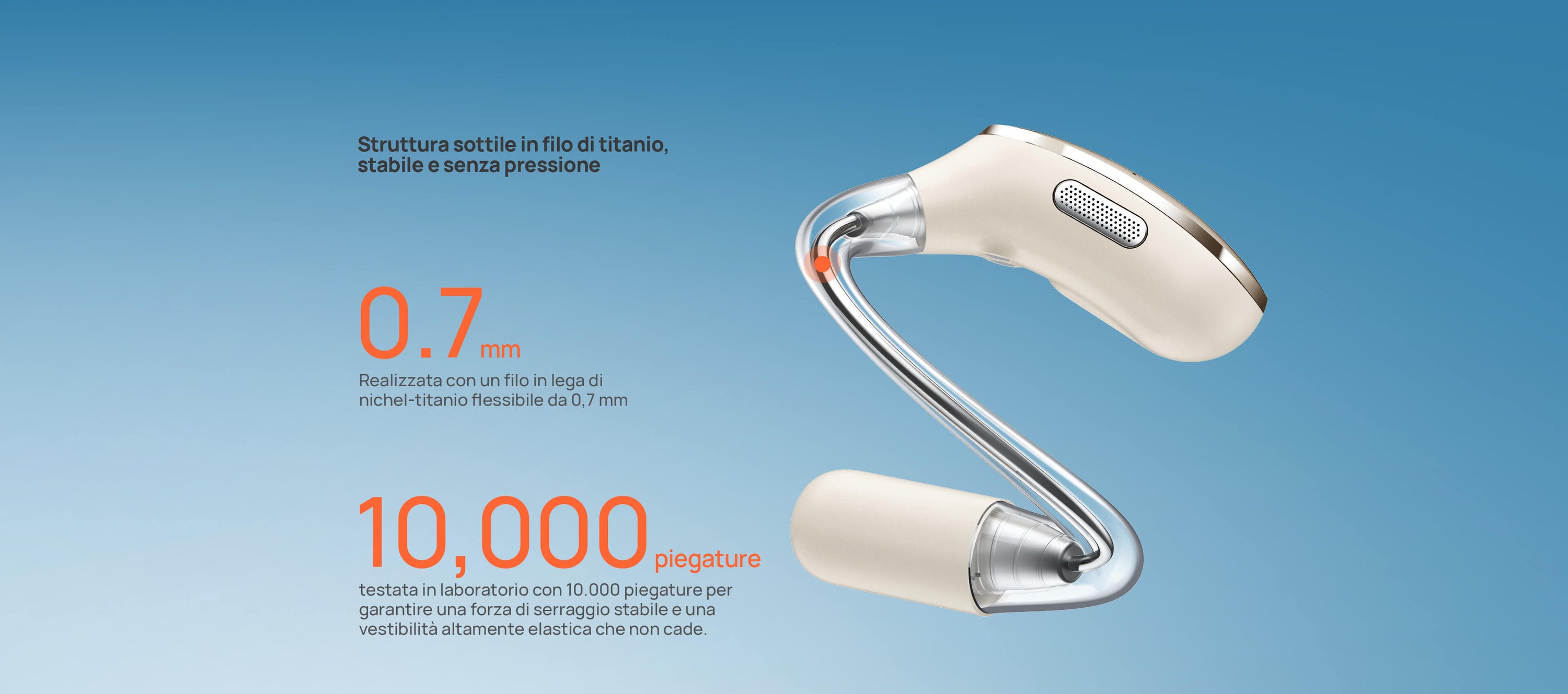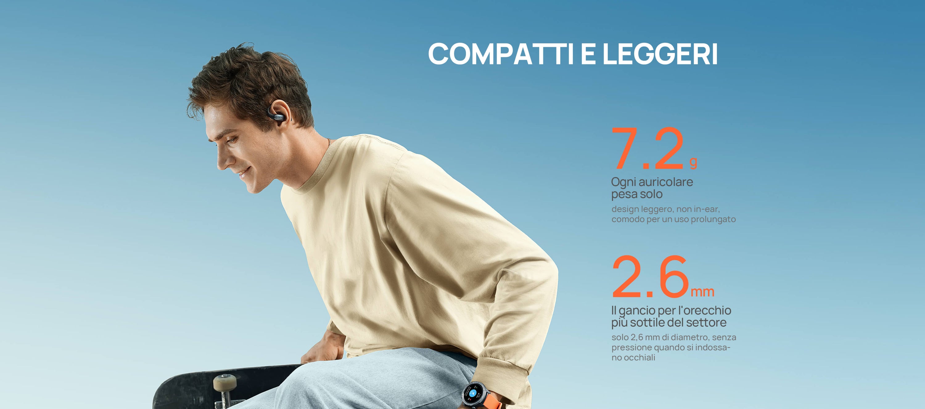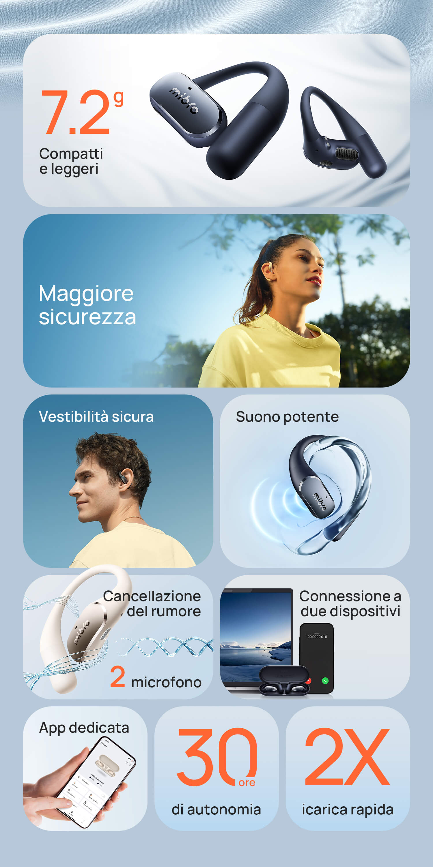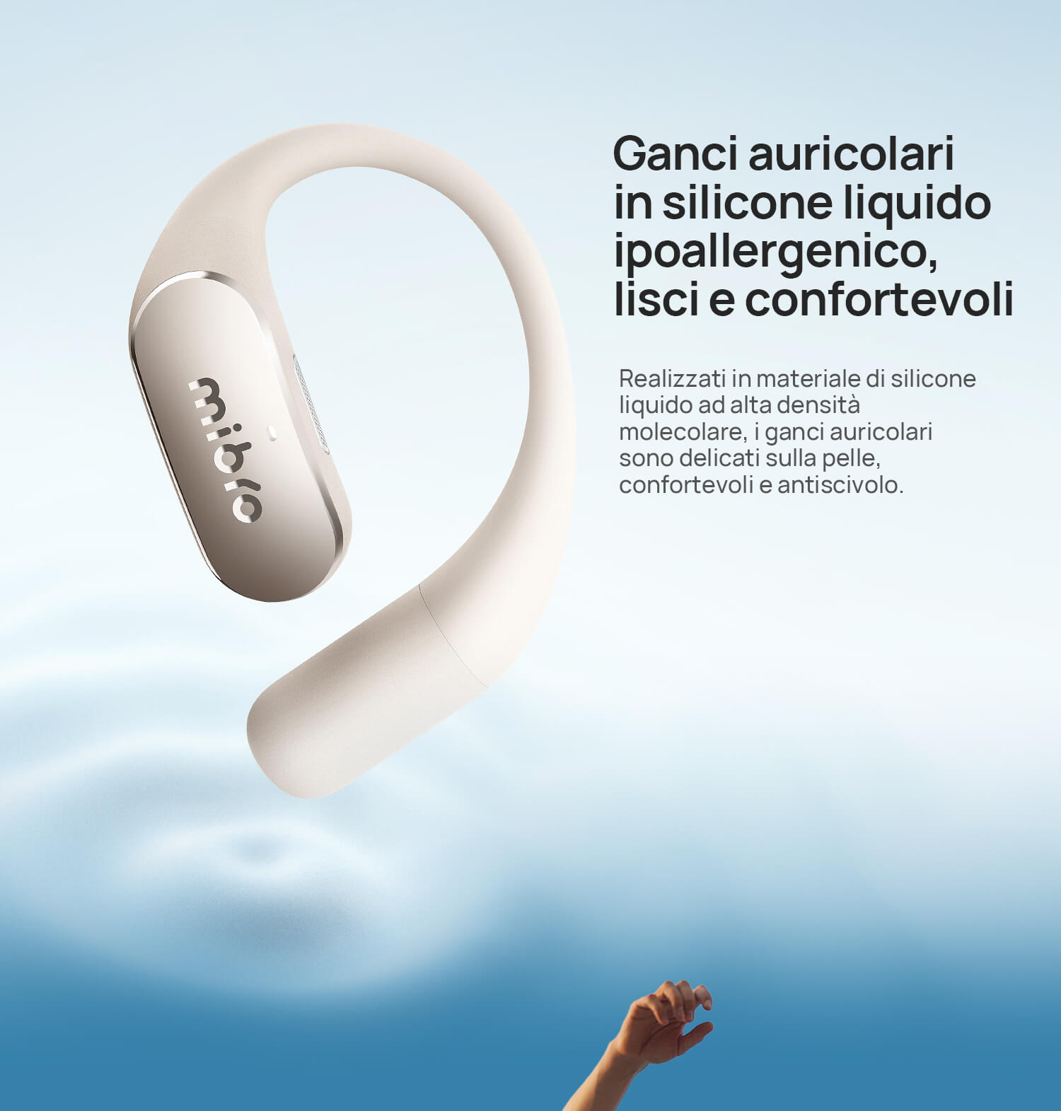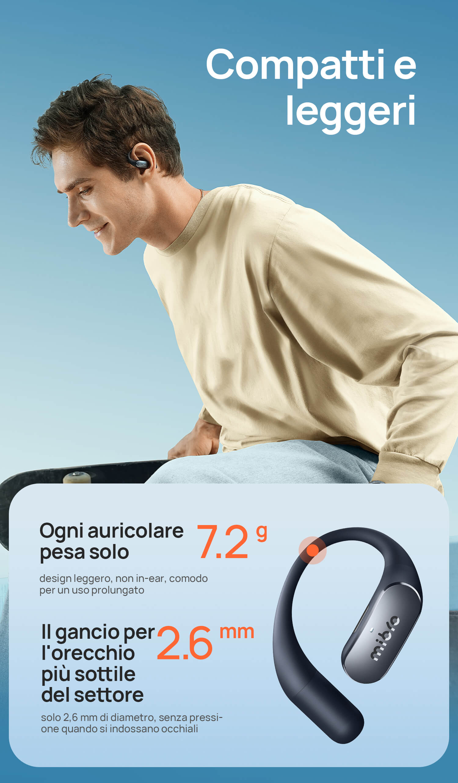 Solo 7,2g con struttura open-ear senza pressione. I ganci in titanio sottile e silicone molecolare sono ipoallergenici e antiscivolo.