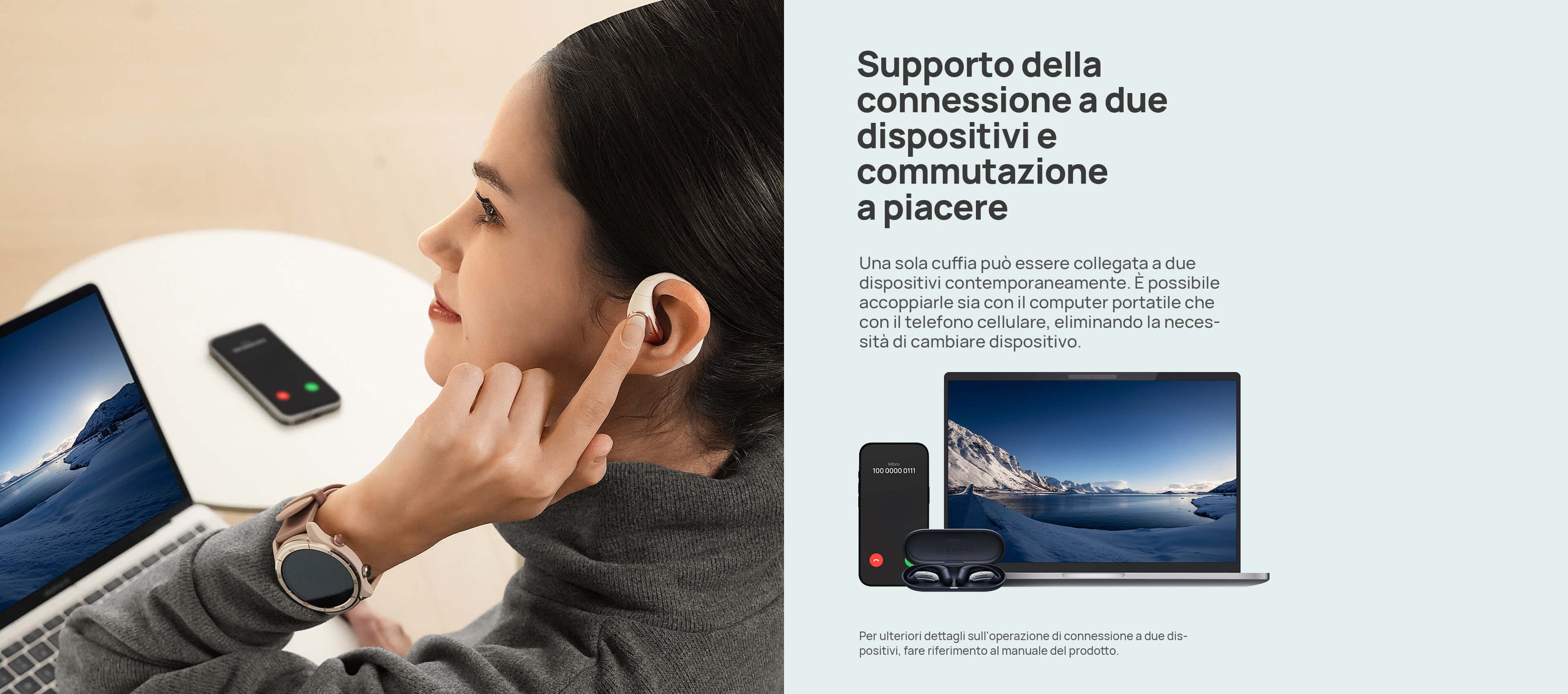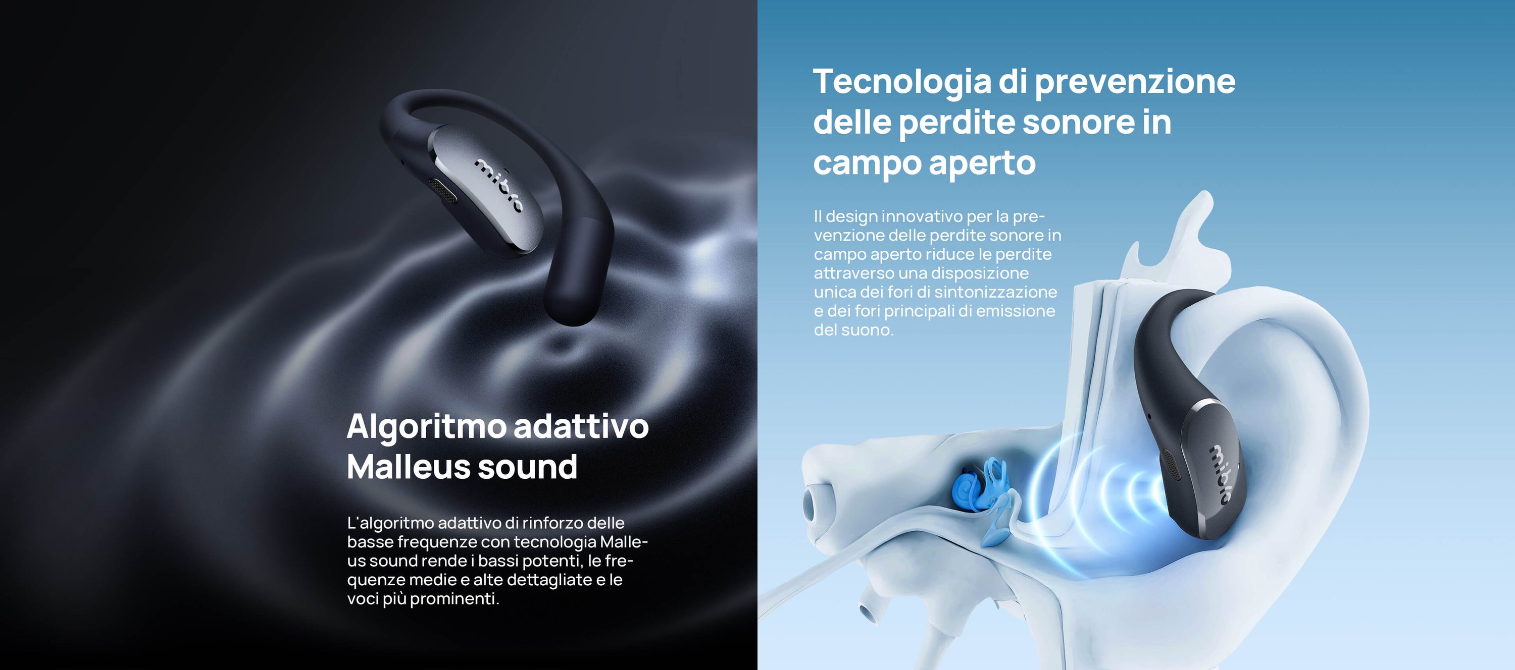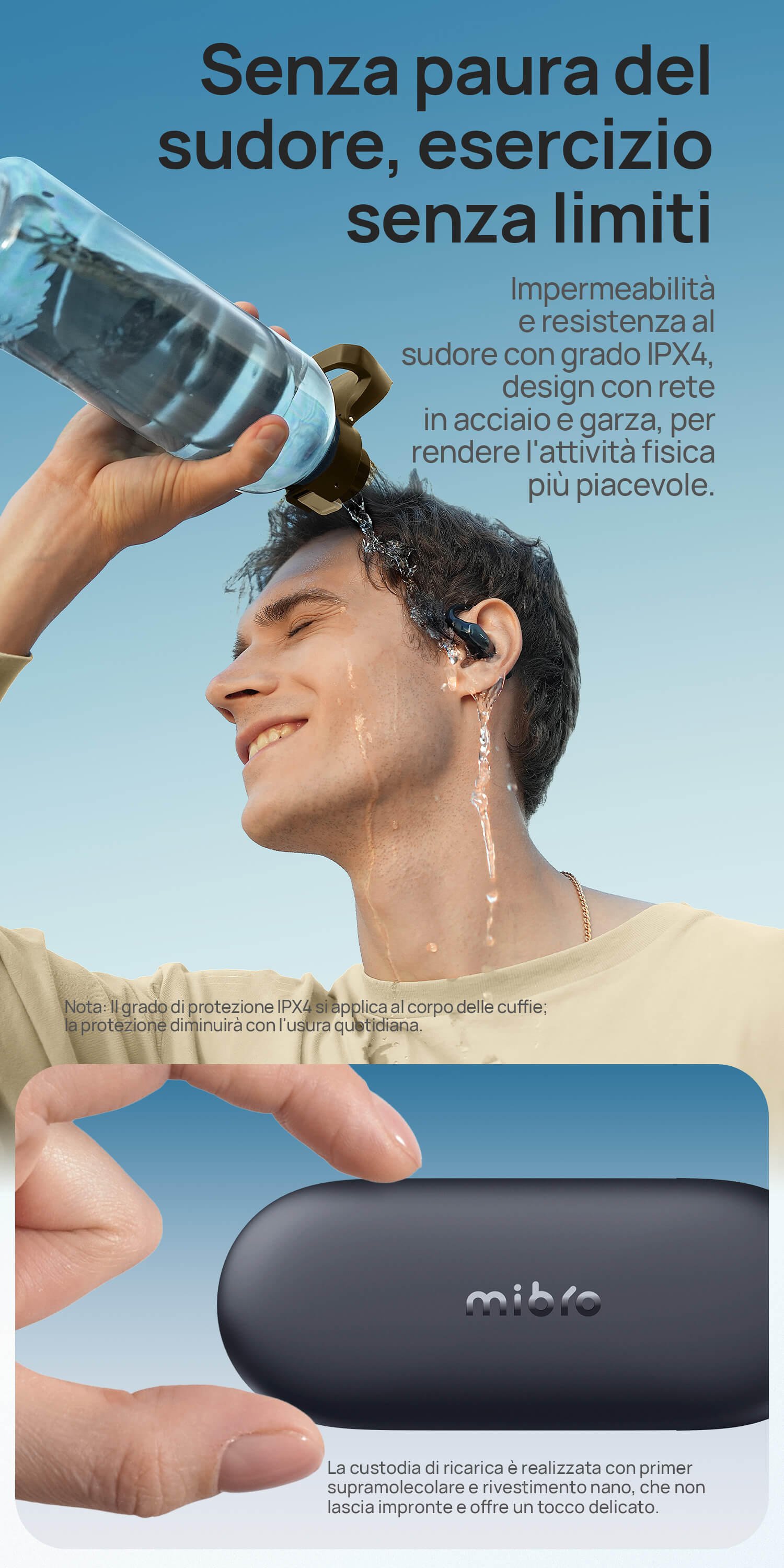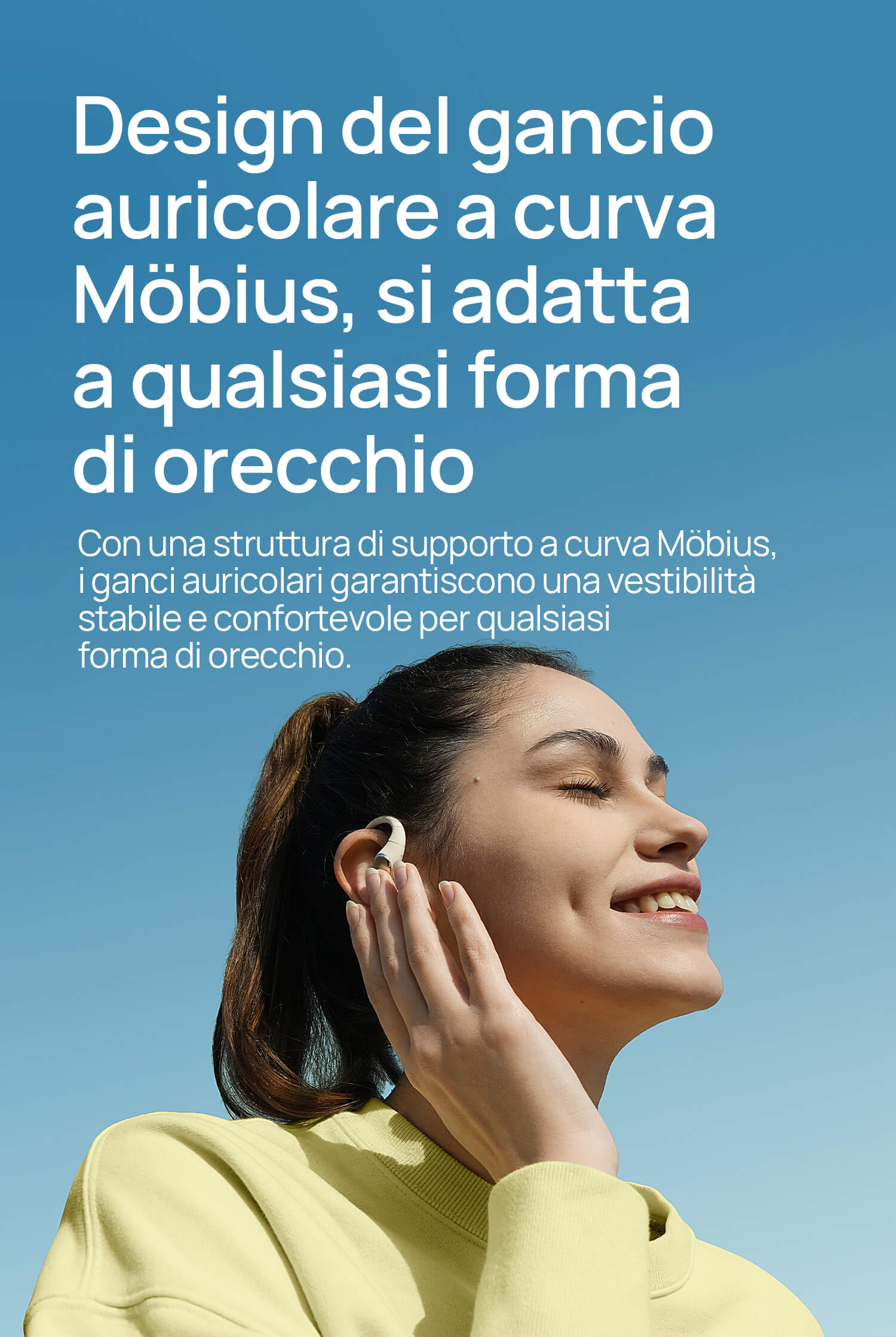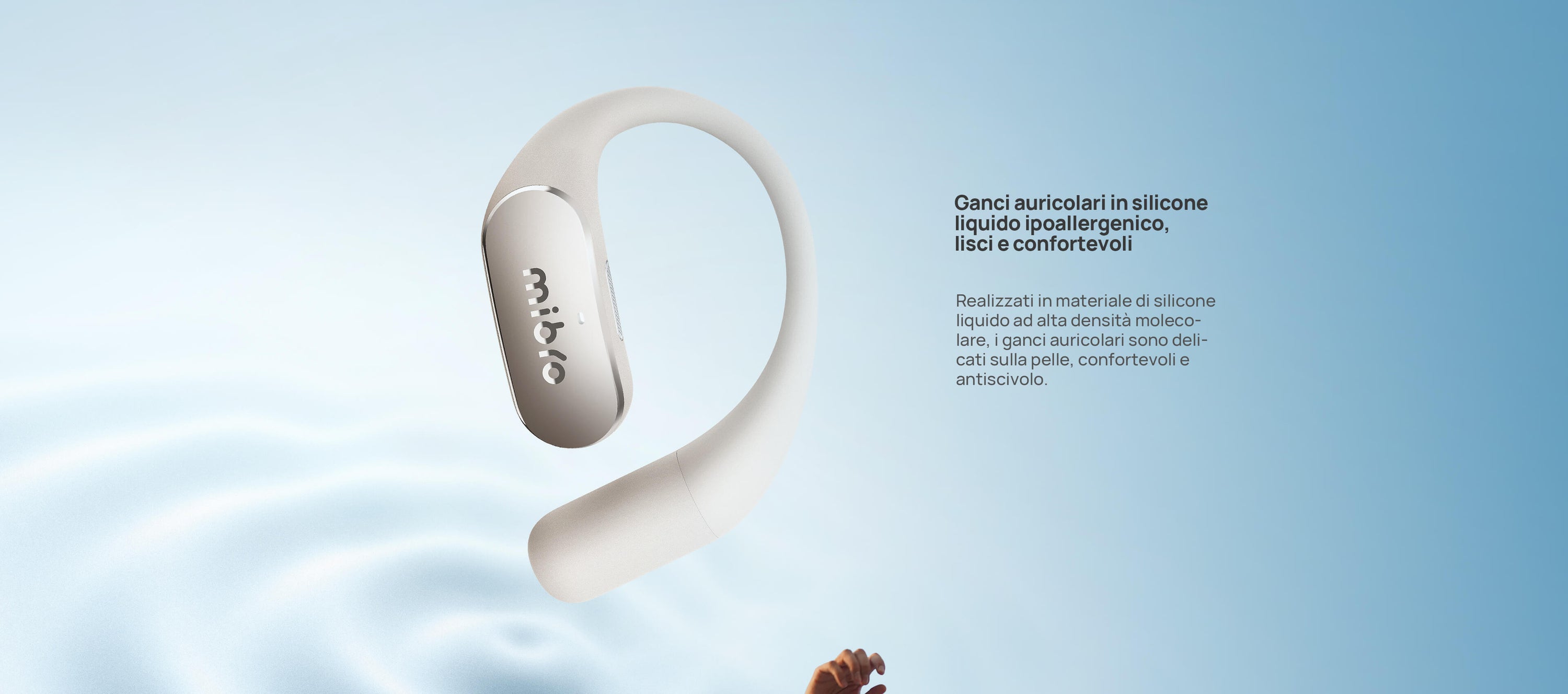 Solo 7,2g con struttura open-ear senza pressione. I ganci in titanio sottile e silicone molecolare sono ipoallergenici e antiscivolo.