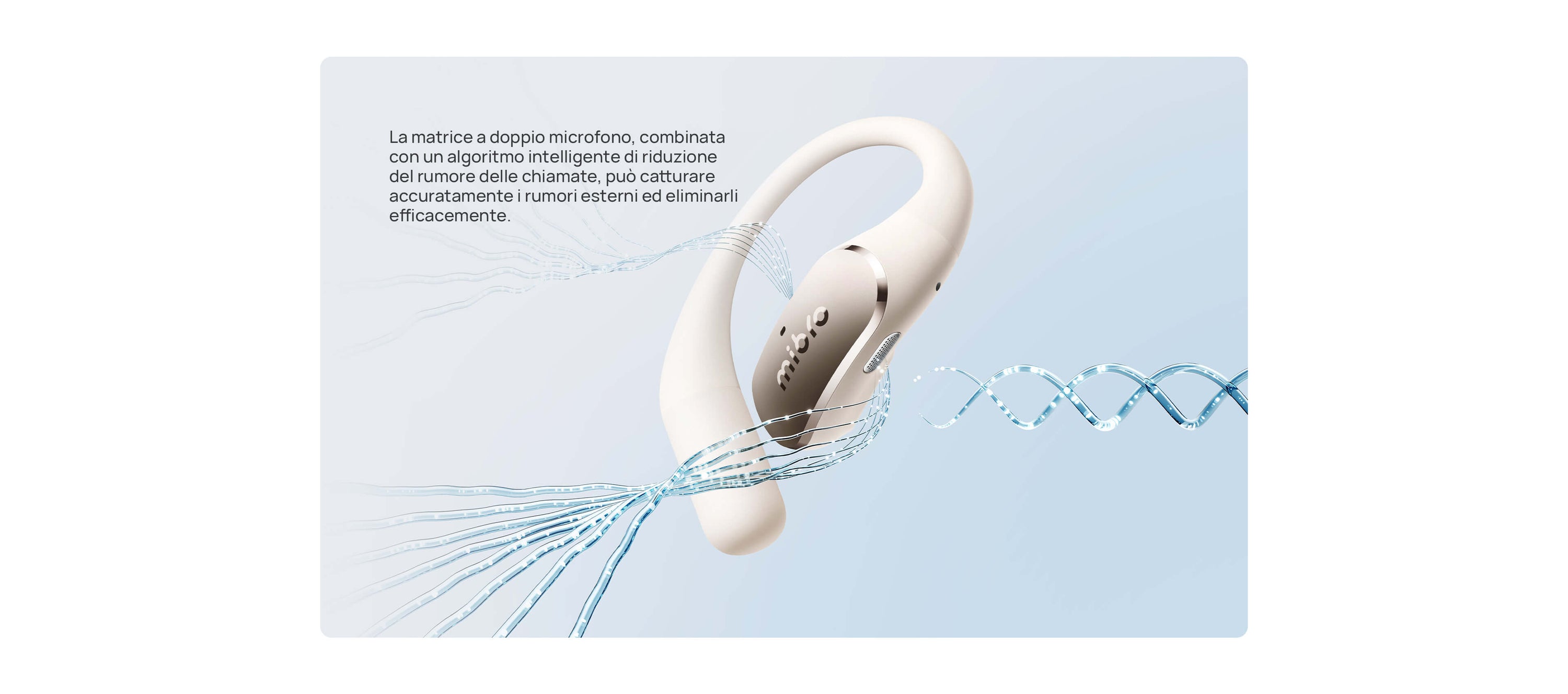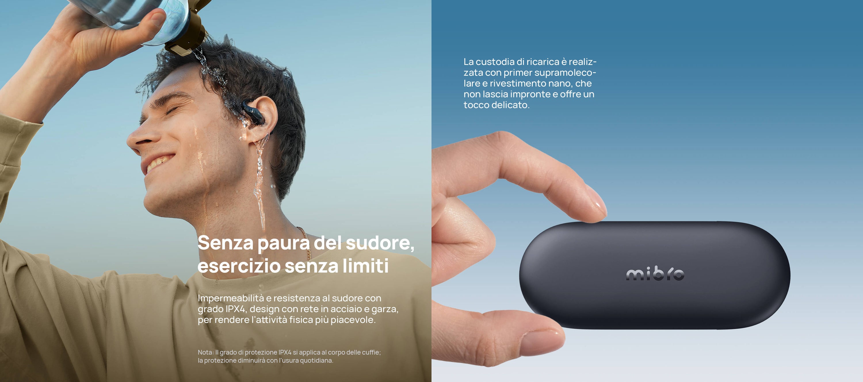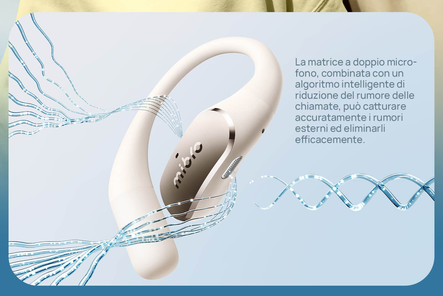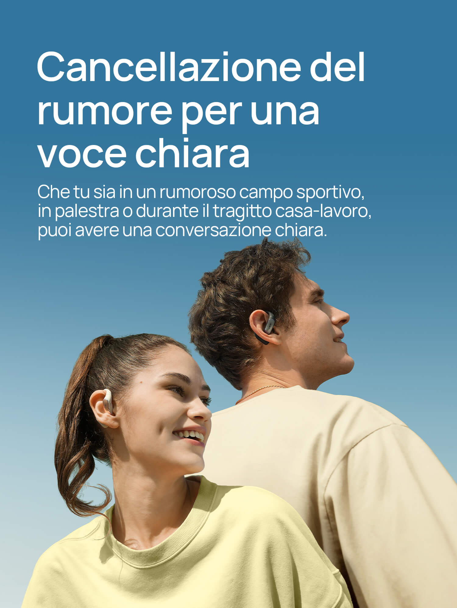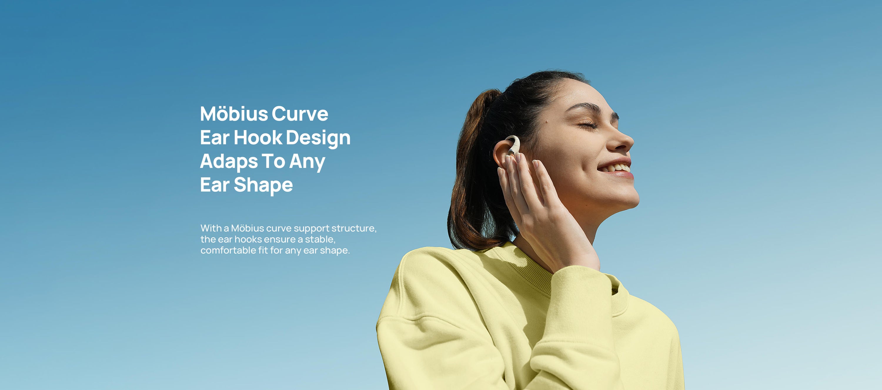 Solo 7,2g con struttura open-ear senza pressione. I ganci in titanio sottile e silicone molecolare sono ipoallergenici e antiscivolo.