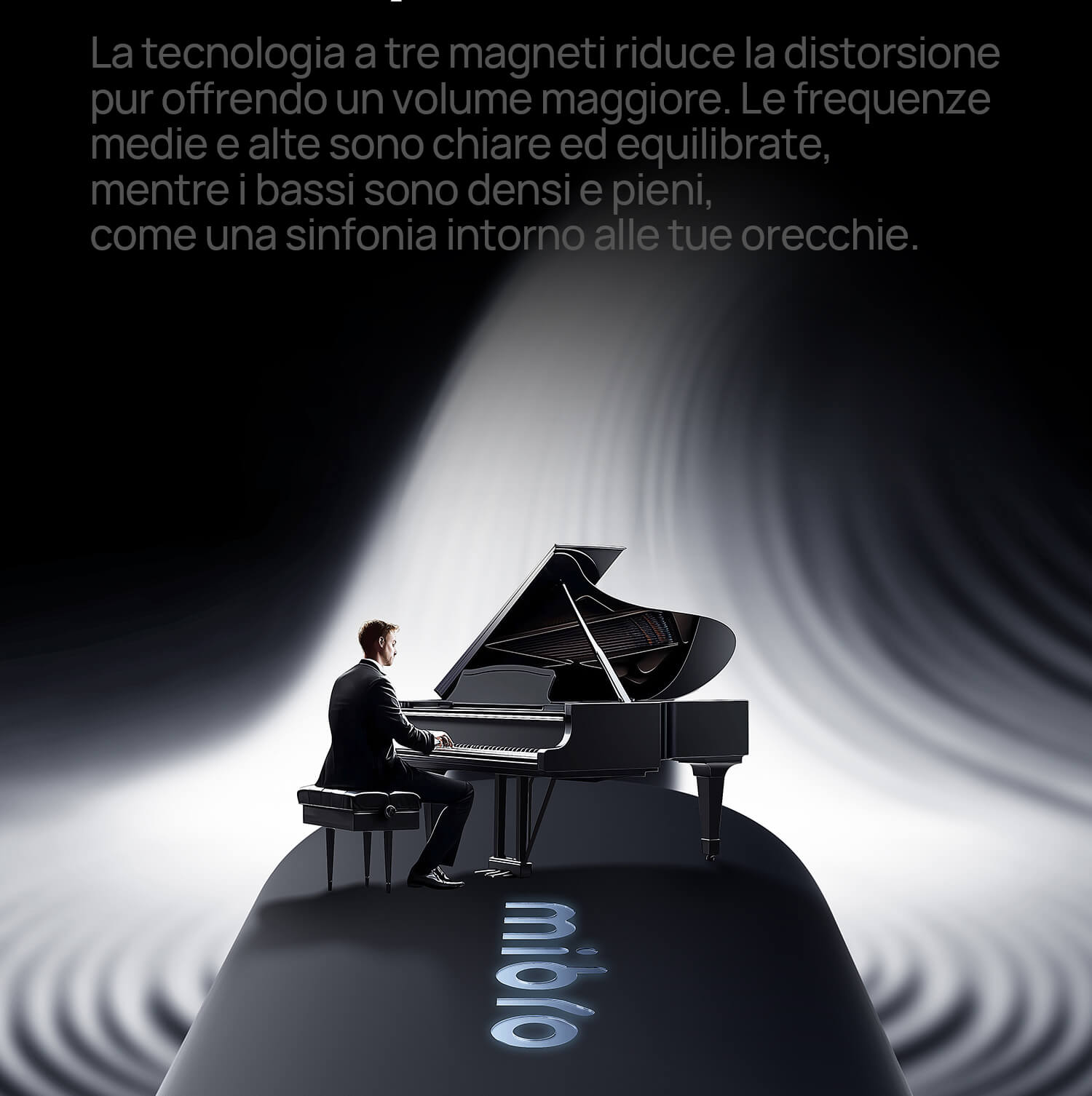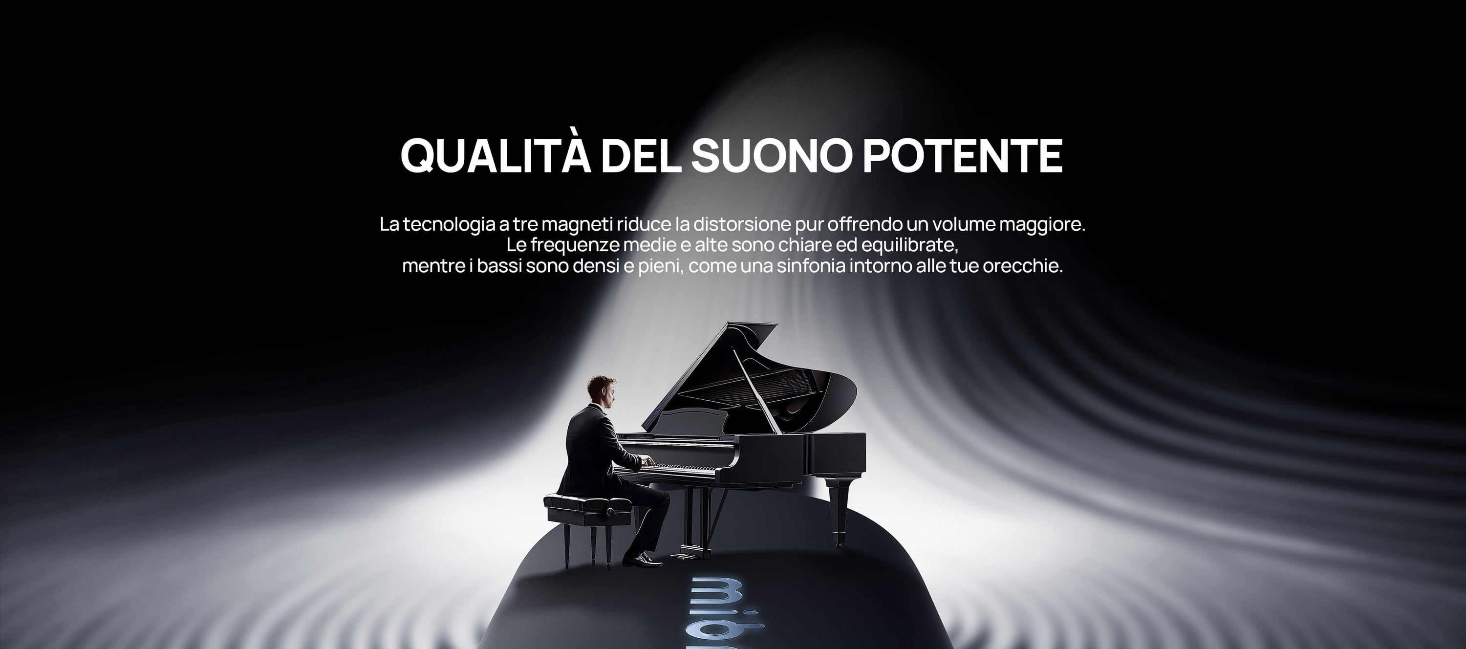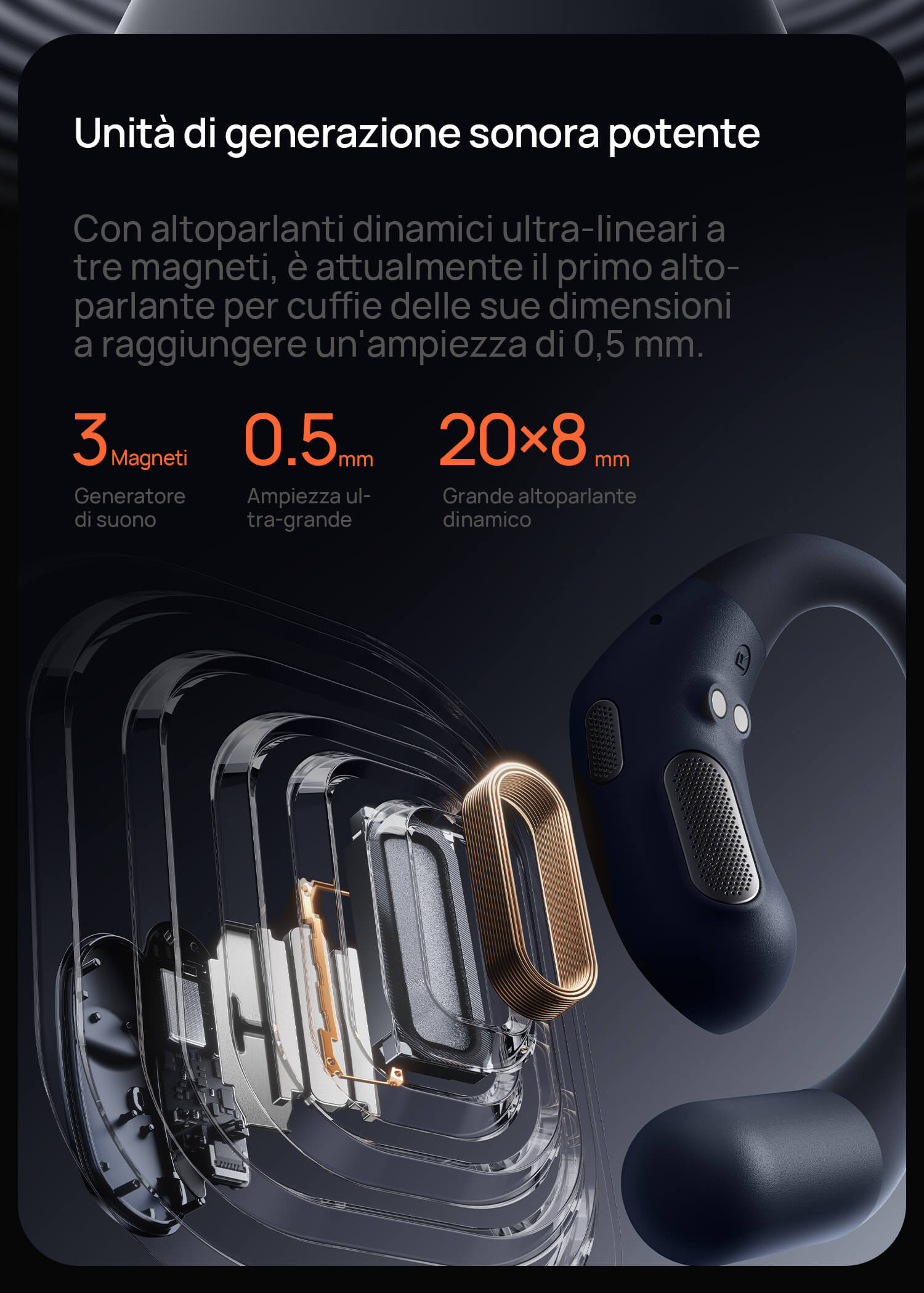 Tecnologia acustica aperta mantiene i suoni ambientali. Fori acustici unici riducono le dispersioni. Medie e alte nitide, bassi ricchi e profondi.