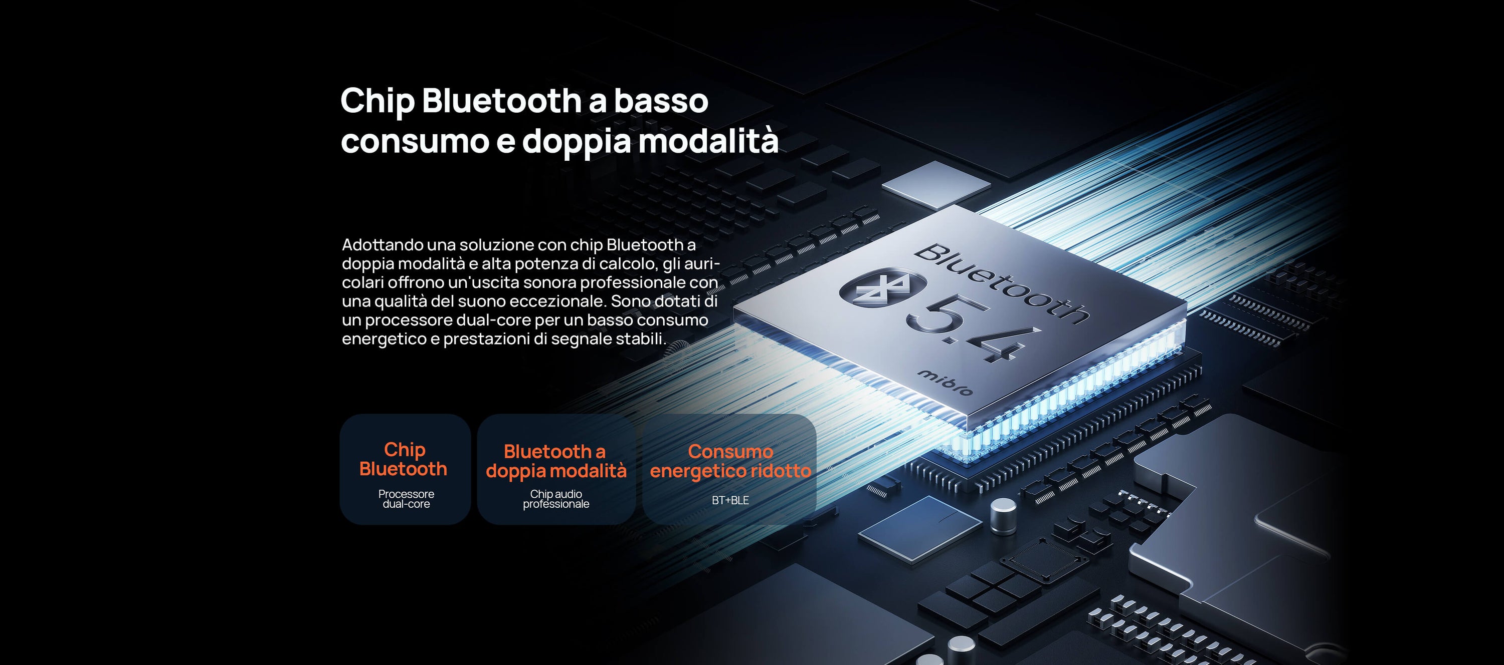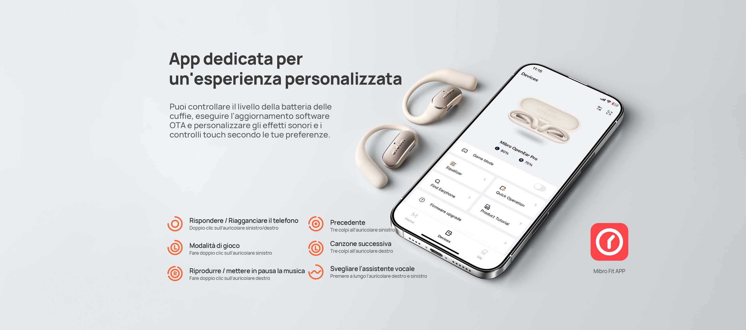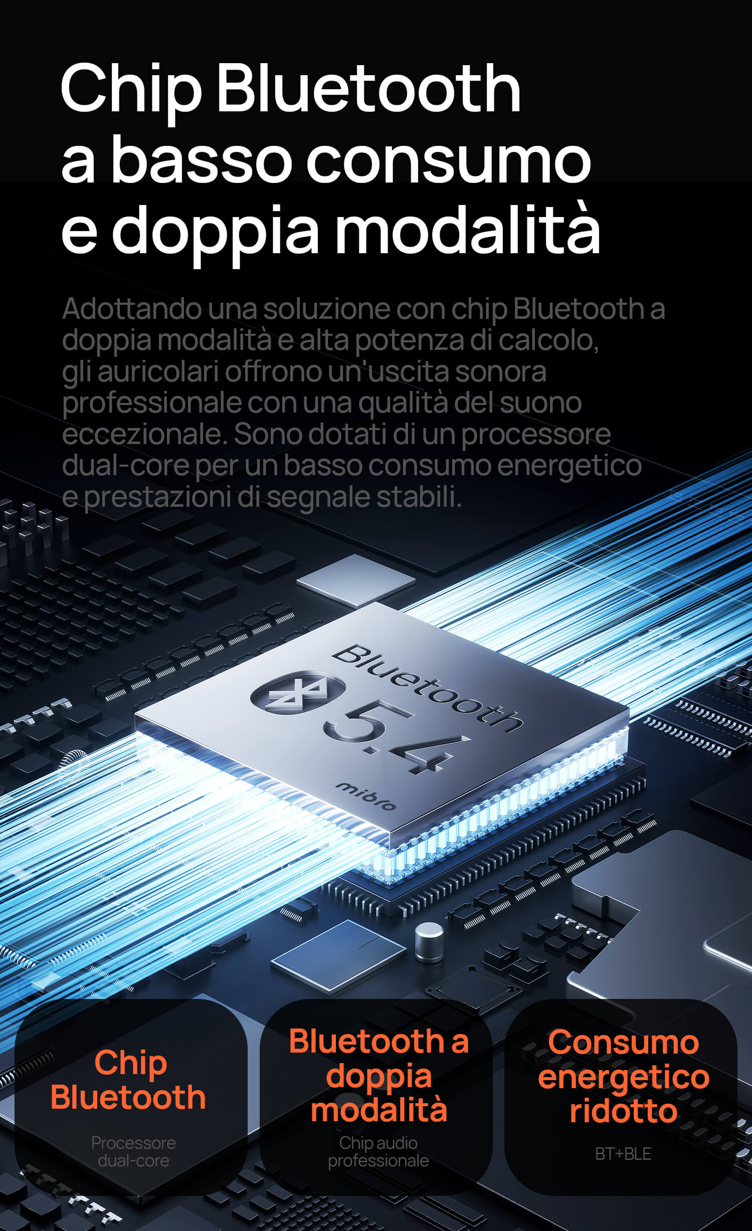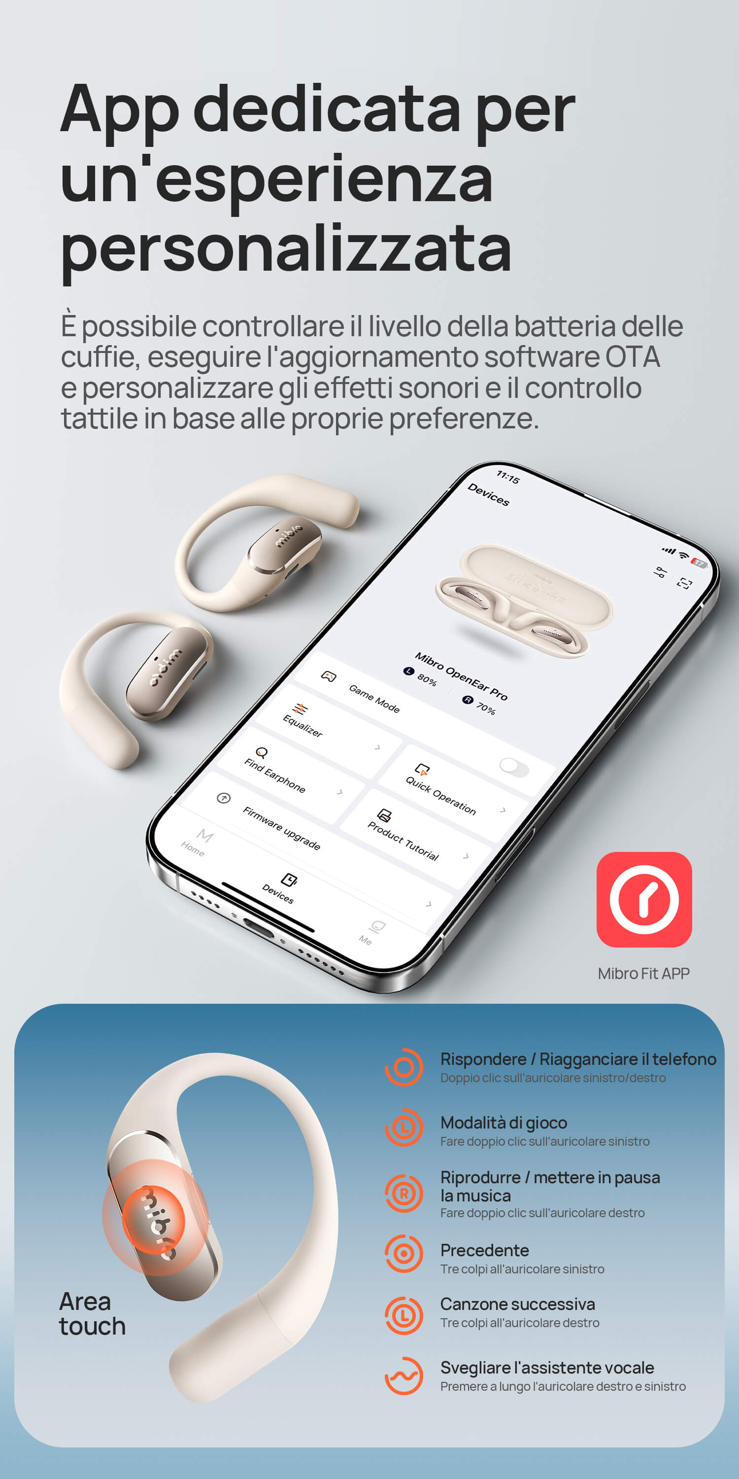 Tocca per play/pausa, scorri per il volume. Bluetooth 5.4 si collega a 2 dispositivi (es. telefono + PC) in simultanea.
