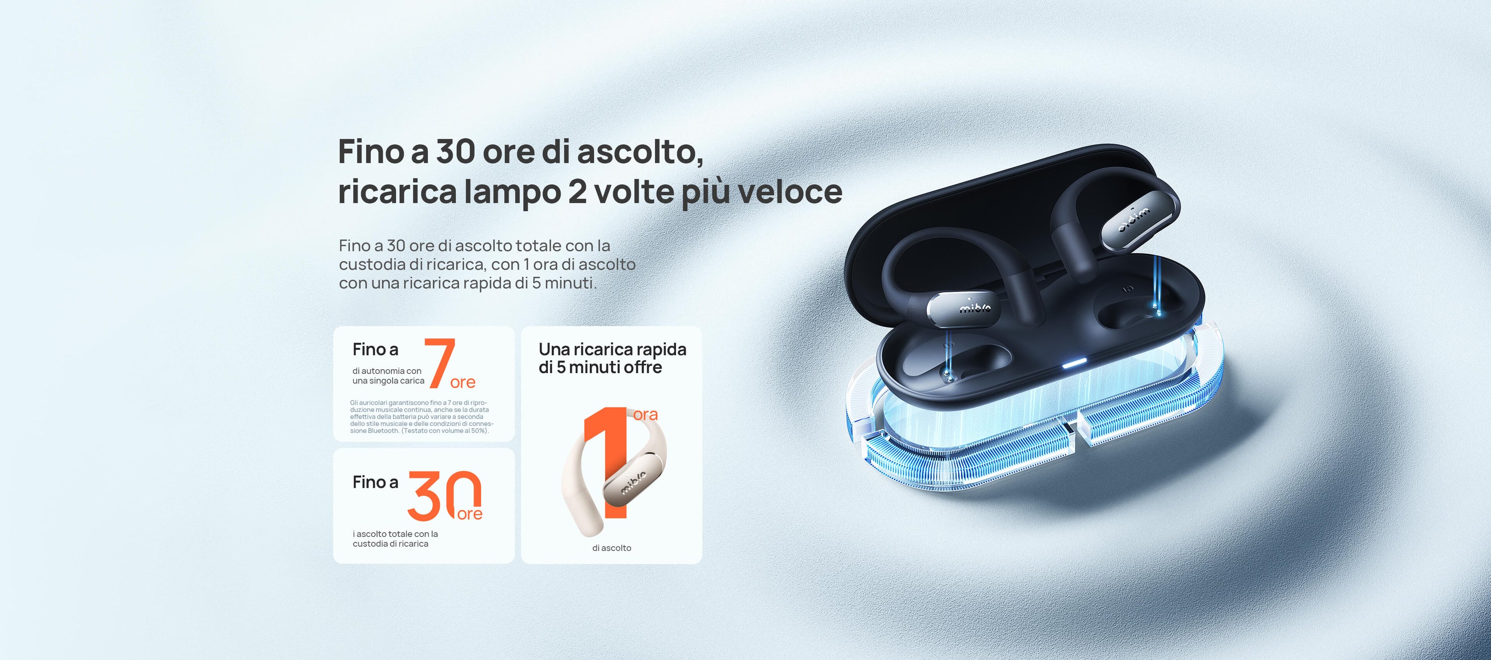 Fino a 7 ore per carica + 30 ore con il case. 10 minuti di ricarica = 2 ore di musica. Case magnetico ultra-compatto.