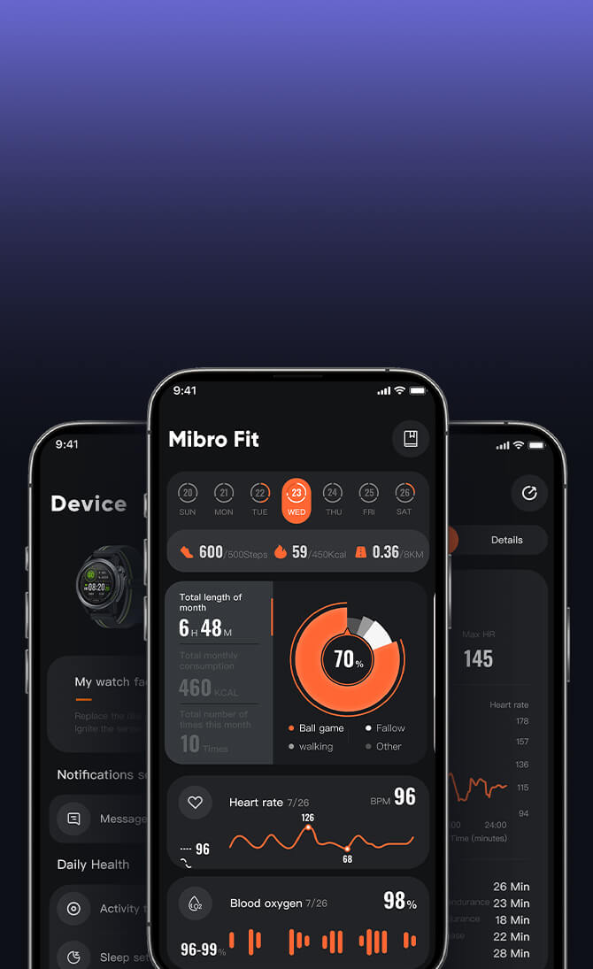 Monitors exercise heart rate & alerts, blood oxygen (high-altitude safety), sleep stages (REM, deep, light), stress levels, and offers breathing training for holistic well-being.