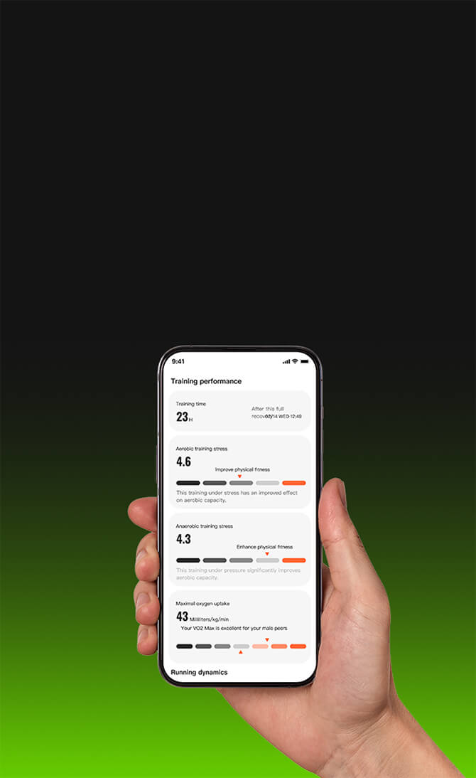 Offers scientific training plans (5K-Marathon), real-time running dynamics (cadence, stride length), VO₂ Max tracking, race prediction, and data-driven guidance for optimal performance.