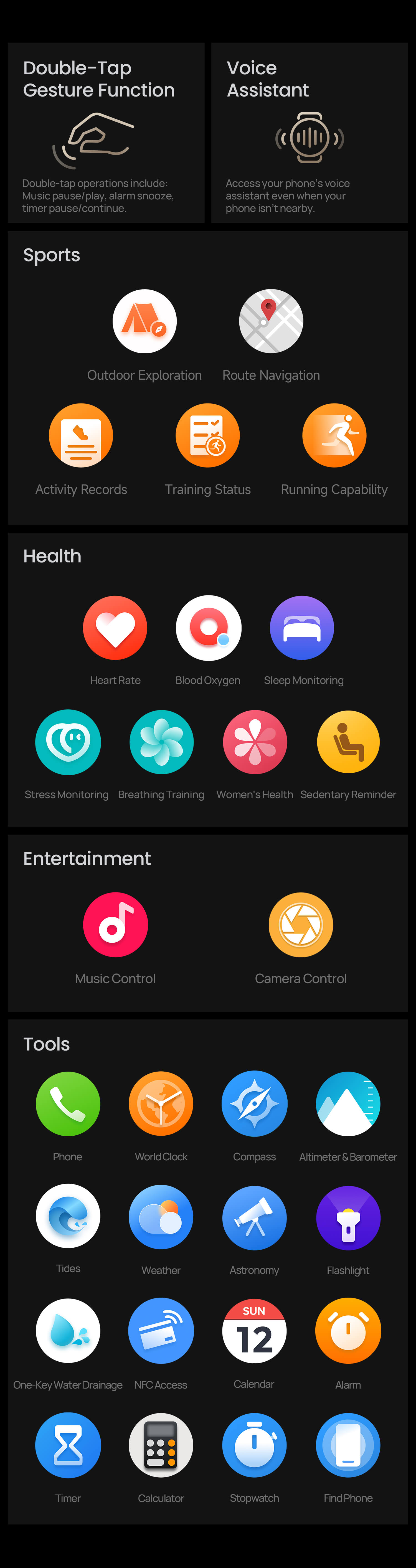 Health: Heart rate,Blood oxygen,Sleep,Stress,Breathing,Menstrual cycle,Sedentary reminder.