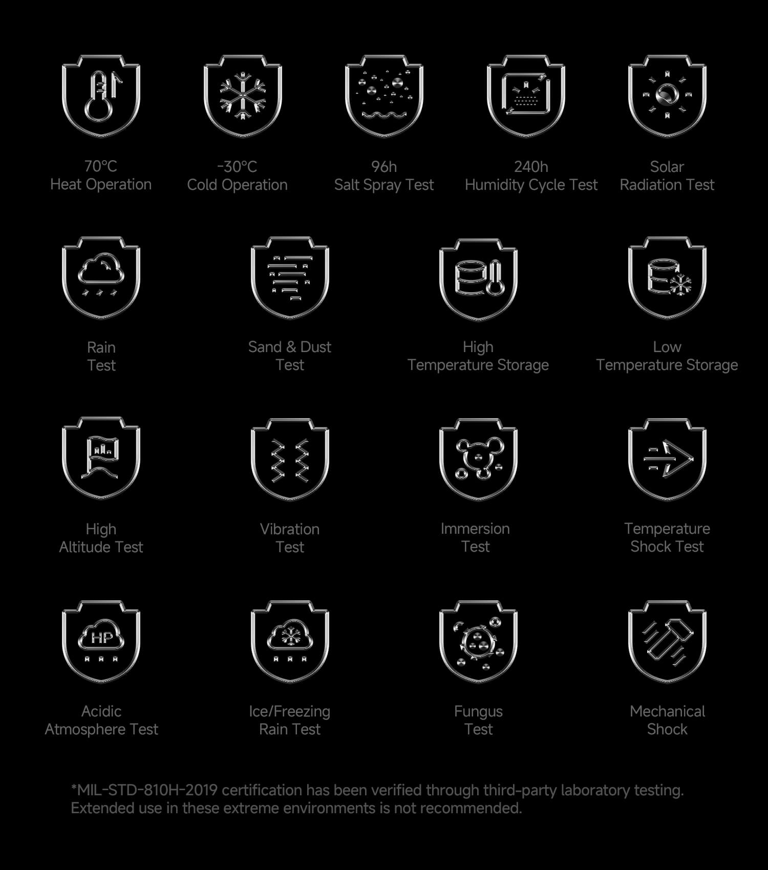 Complies with 17 military-grade specifications under MIL-STD-810H-2019,