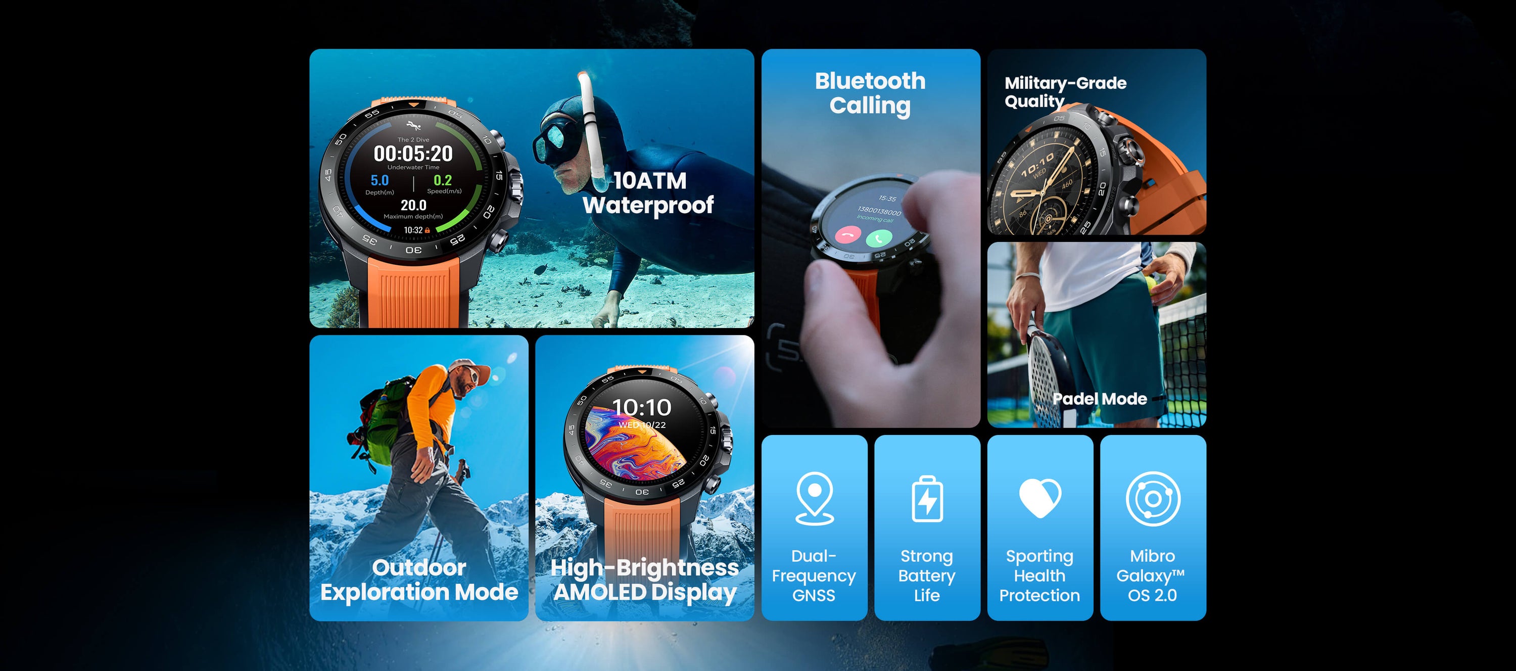 Mibro Galaxy OS 2.0 offers deep personalization (50+ data cards), syncs with Strava/Apple Health/Google Fit, and supports 150+ sports modes, including Padel stroke analysis.