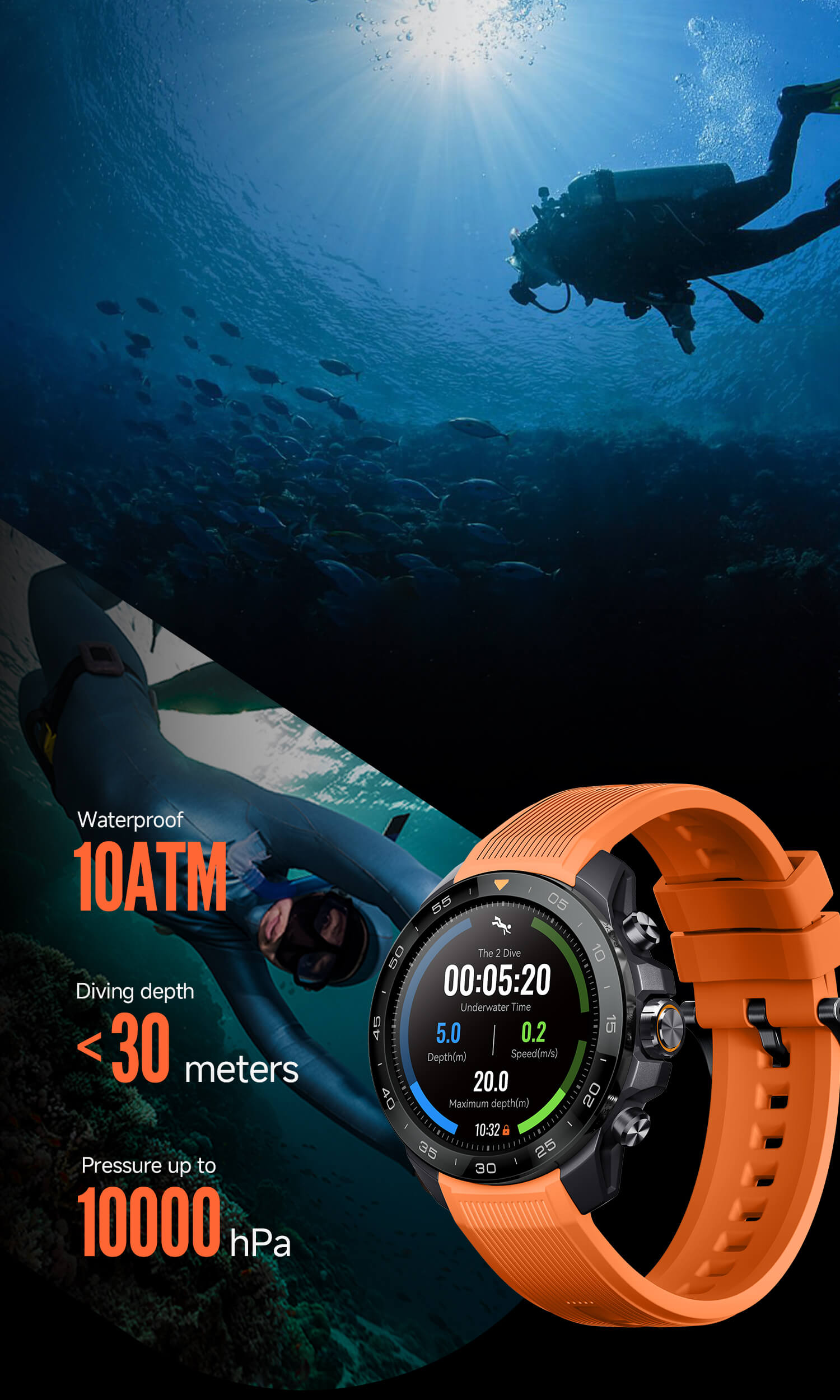 Track depth (current/max), ascent/descent speeds, dive time, and count in real-time. Set custom depth/time warnings with visual+vibration alerts. The bright AMOLED screen and 3-button controls work flawlessly underwater, even with gloves.