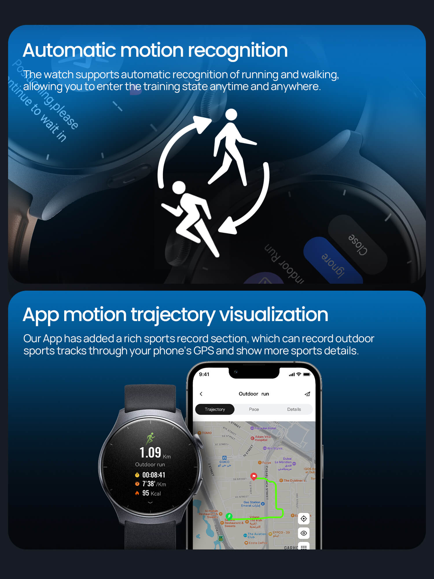1.3 inch Amoled screen shows more detailsResolution: 360x360 Color gamut: 16.77 millionRefresh rate: 60fpsAOD display