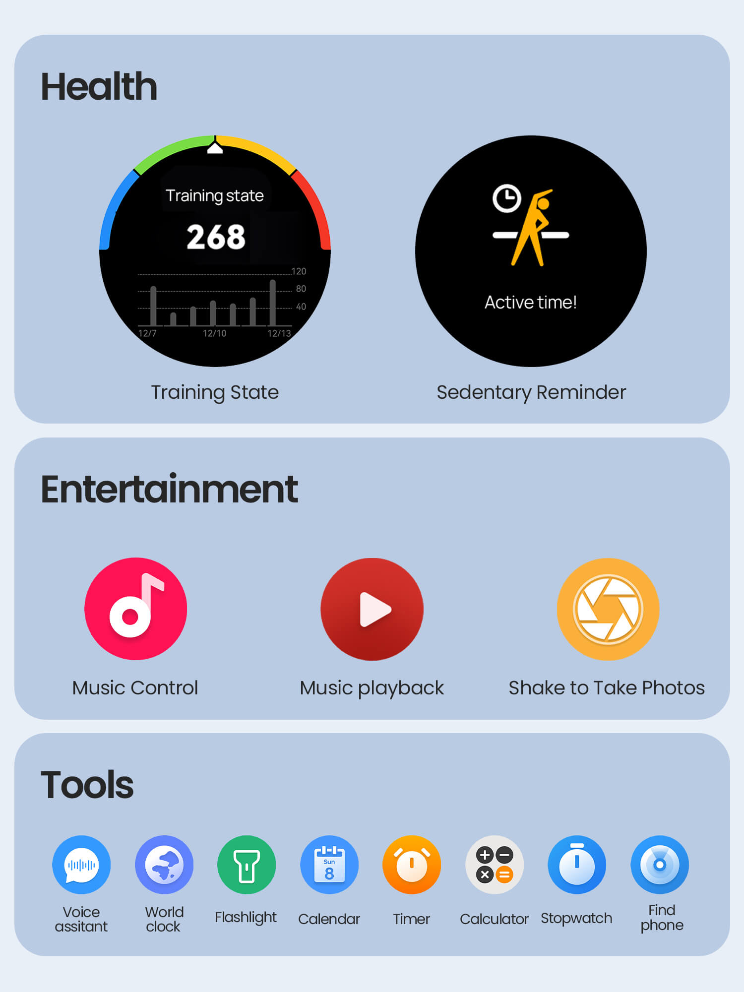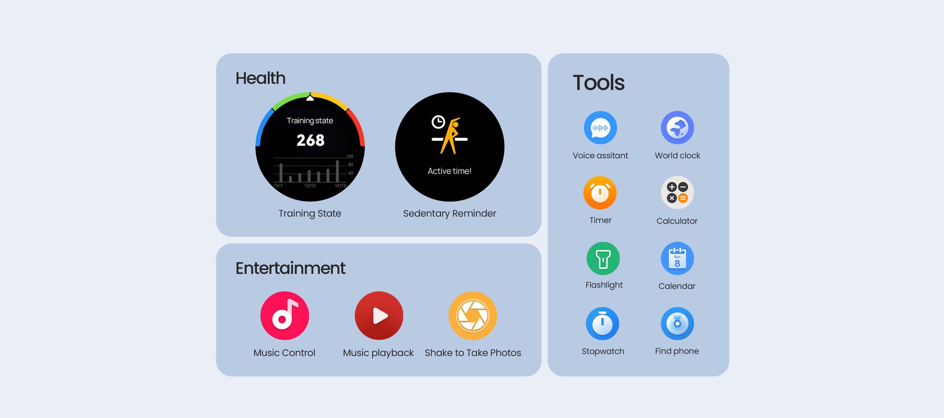 Heart Rate,SpO2,Motions record,Breath,Preesure,Sleepping record,Altitude, Compass, Dice,Timer,Alarm,Stop watch,Calculator,Calendar,Weather,Women's health,Find your phone,Bluetooth call, Music control, Music playing,App message reminder,Incoming call reminder,Health Reminder..