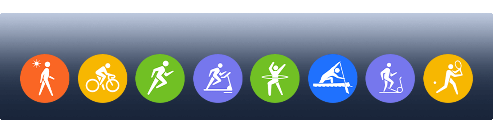 1. Popular sports:Outdoor Run,Indoor Run,Outdoor Walk,Pool Swim,Jump Rope,Elliptical,Row Indoor,Free Training.2.Fitness:Sit-up,Indoor Cycling,Strength,Push-up,Step Machine,Yoga,Pilates,Stair Stepper,Dumbbell,Barbell,Weightlifting,Bobby Jump,Stretching,Core Training,Gymnastics,Combat Fitness,High Bar,Parallel Bars.3.Dances:Square dancing, Street dancing, Belly dancing, Jazz dancing, Latin dancing, Ballet, Zumba, Ballroom dancing.4.Leisure sports:Padel,Pickleball,Roller skating, Archery, Horseback riding, Tug of war, Hula hoop, Kite flying, Frisbee, Equestrian, Racing.5.Balls:Basketball, Football, Badminton, Table tennis, Tennis, rugby, Billiards, Bowling, Volleyball, Handball, Baseball, Softball, Cricket, Beach football, Beach volleyball, Gateball, Hockey, Squash, Water polo, Rattan ball, Dodgeball, Golf.6.Fighting:Tai Chi, Taekwondo, Boxing, Free fighting, Karate, Fencing, Kendo, Muay Thai, Wrestling, Martial arts, Judo.7.Water sports:Paddle, Water polo, Water sports, Diving, Snorkeling, Surfing, Sailing, Kayaking, Rowing,Motorboat, Synchronized swimming.8.Snow sports:Skiing, Snowboard, Outdoor skating, Indoor skating, Curling, Skiing, Snowboard,Biathlon.9.Extreme sports:Skate board, Rock climbing, Bungee, Parkour, Skydiving, Paragliding, MTB.